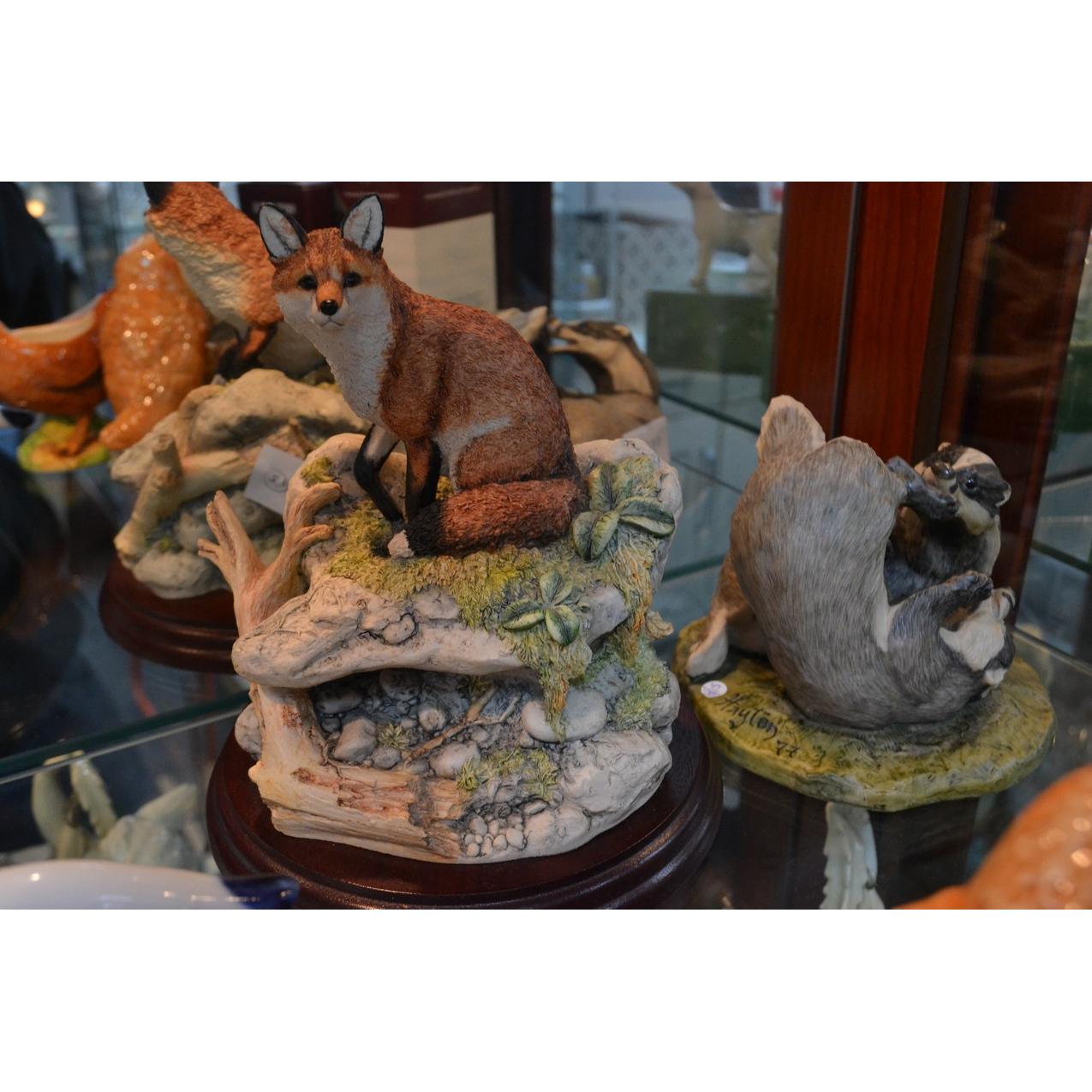 BORDER FINE ARTS made in Scotland Hayton Fox on a rock H 18cm and playing badgers also made in Scotland H 13cm