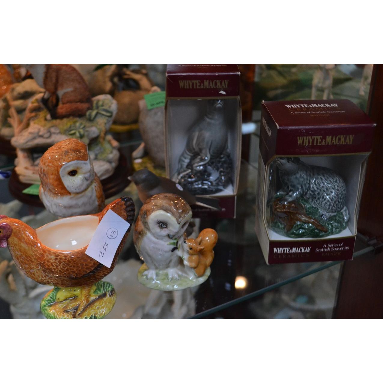 Mixed lot to include 2 BESWICK WHITE & MACKAY whisky small miniatures, both around 9cm H and in original boxes, BESWICK Beatrice Potter 'Old Mr Brown' model 9cm H, and a Chaffinch model H 7cm approx, and an Owl 12 cm H, and BORDER FINE ARTS ceramic chicken egg cup H 9cm