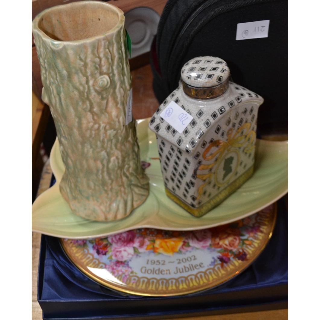 Four pieces of china to include Golden Jubilee wall plate, bark style vase, leaf plate etc