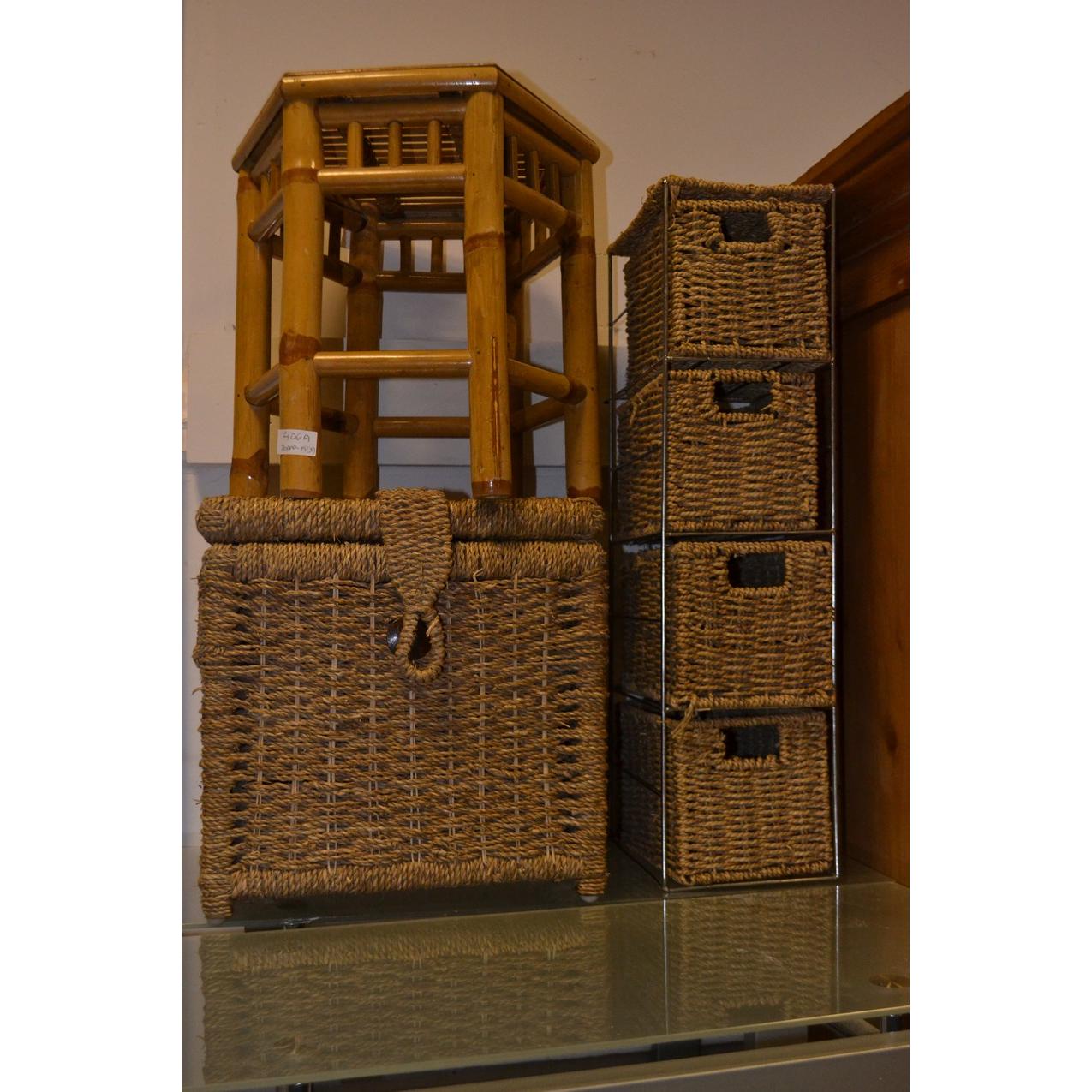 Selection of furniture to include 4 drawer wicker storage tower (H: 66cm approx), matching storage box (H: 35cm W:35cm approx) and a bamboo side table