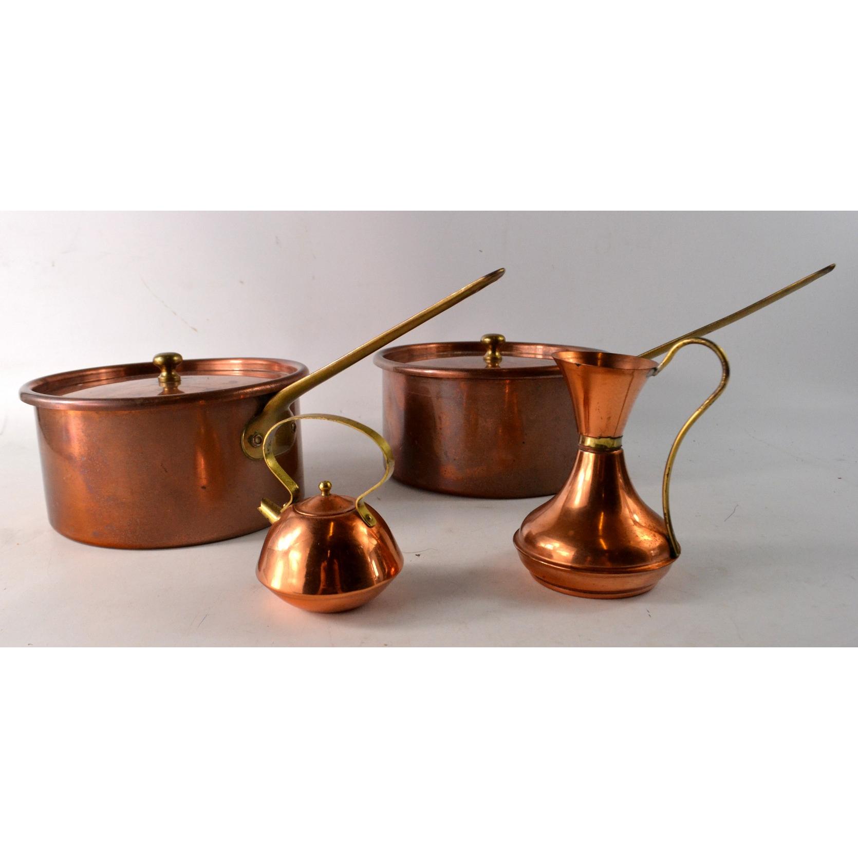 Four pieces of copper to include 2 saucepans (approx 18cm wide), jug, mini kettle