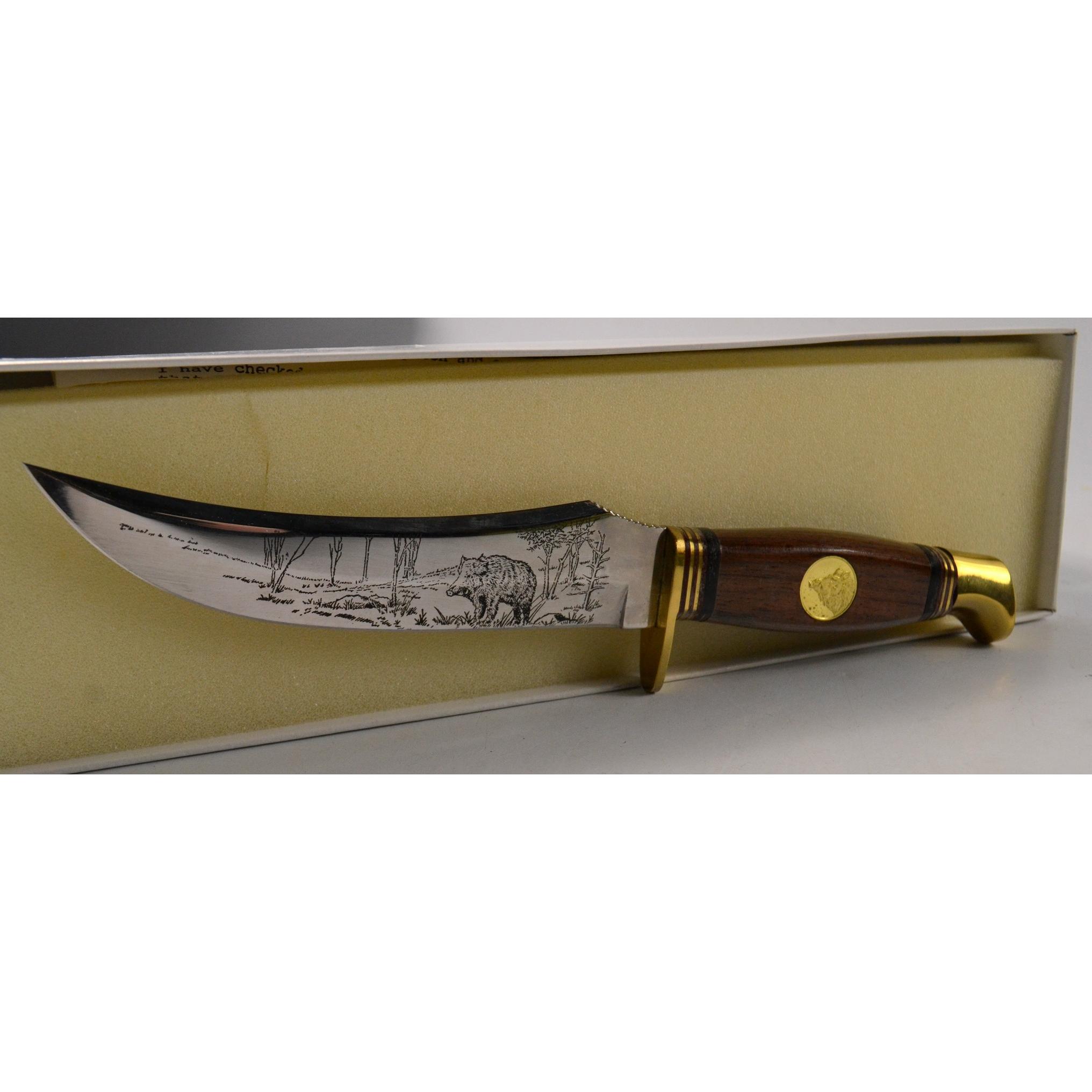 Sportsman knife. Overall length 25.5cm, blade 15cm long depicting a hog on the blade - a nice item