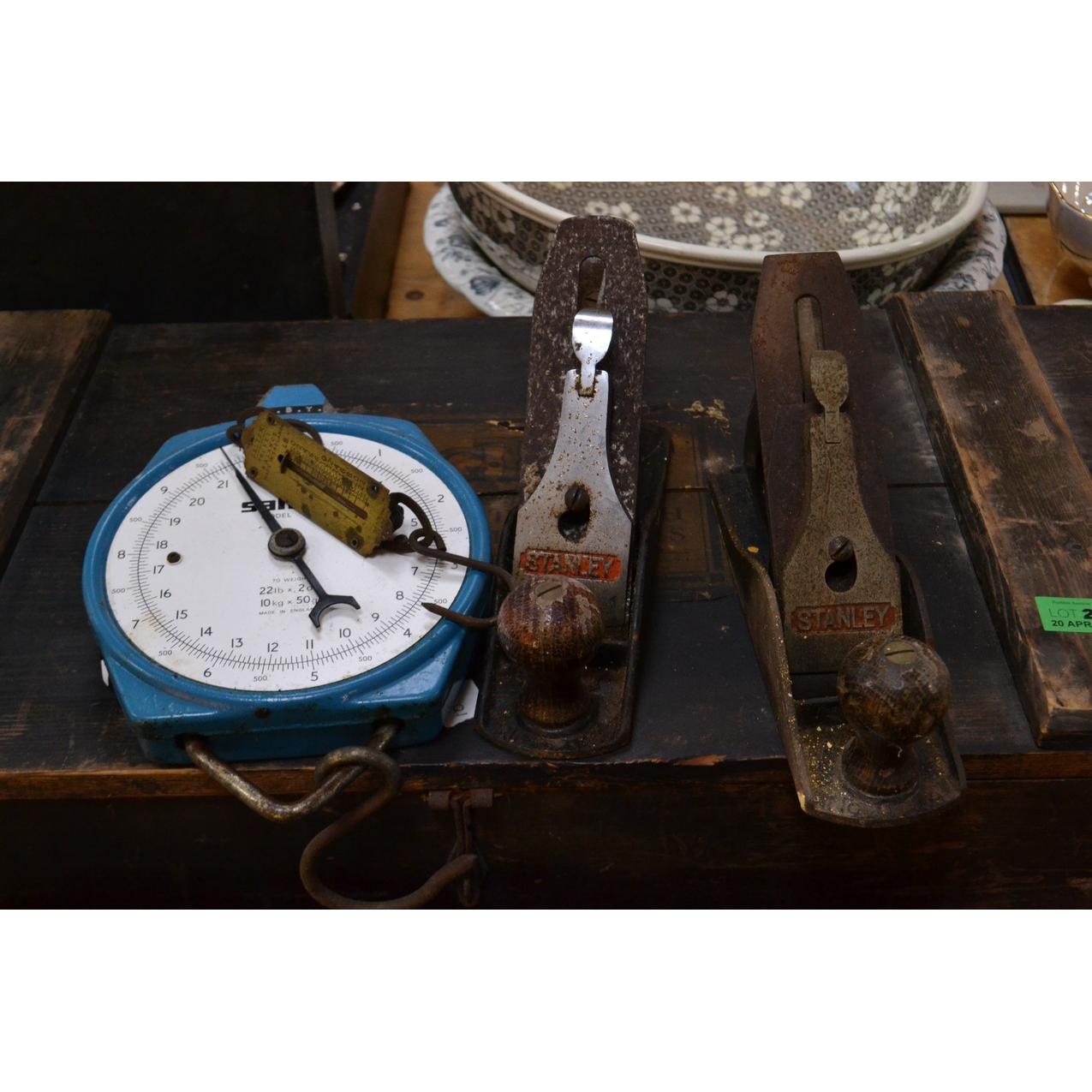 2 old vintage joinery planes, both STANLEY and a blue SALTER vintage scale on a hook!