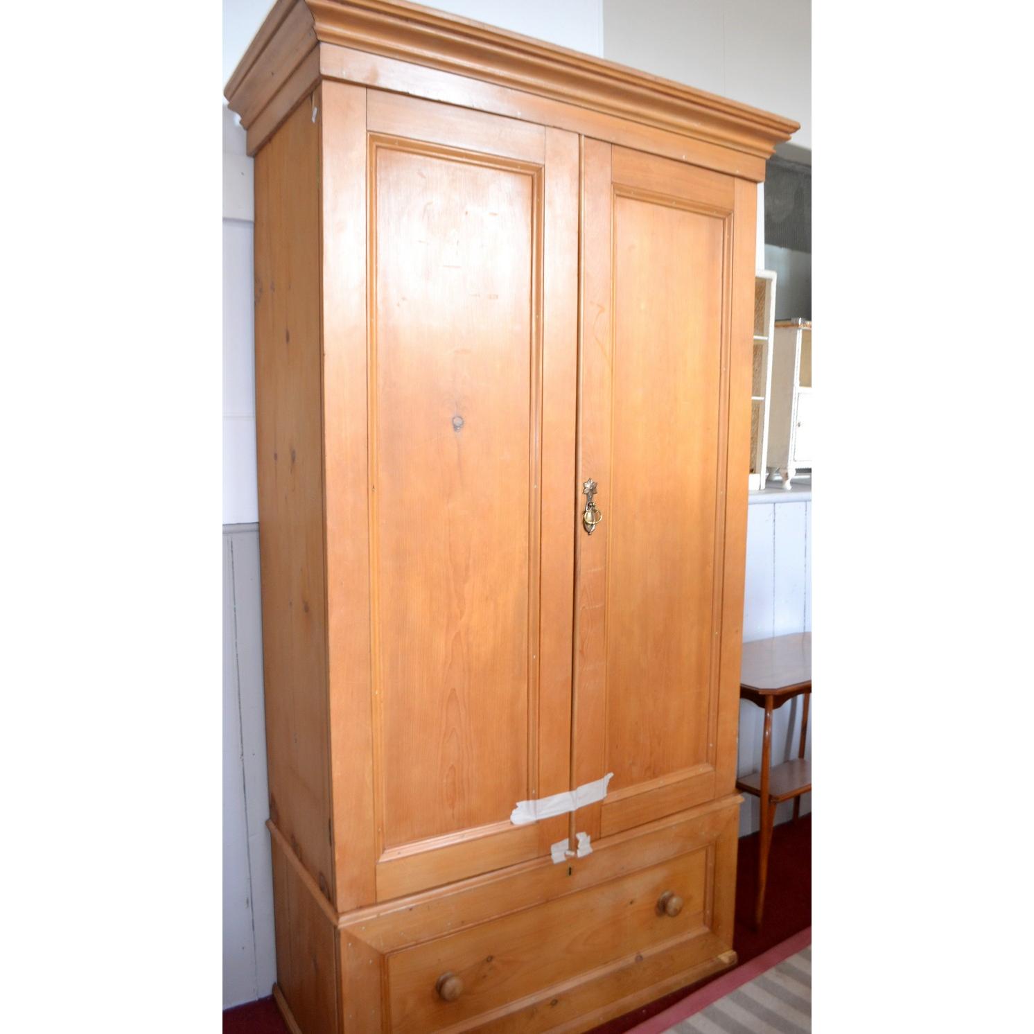 Antique pine wardrobe/linen press with twin inscribed panel doors above a large drawer H: 7ft approx
