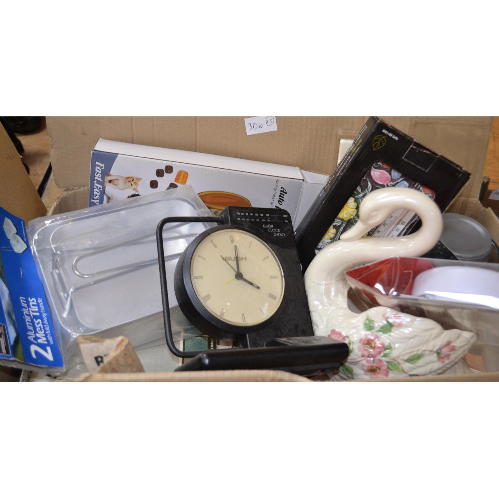 Mixed full box to include an ornamental clock, ceramic swan, glassware, jugs etc etc