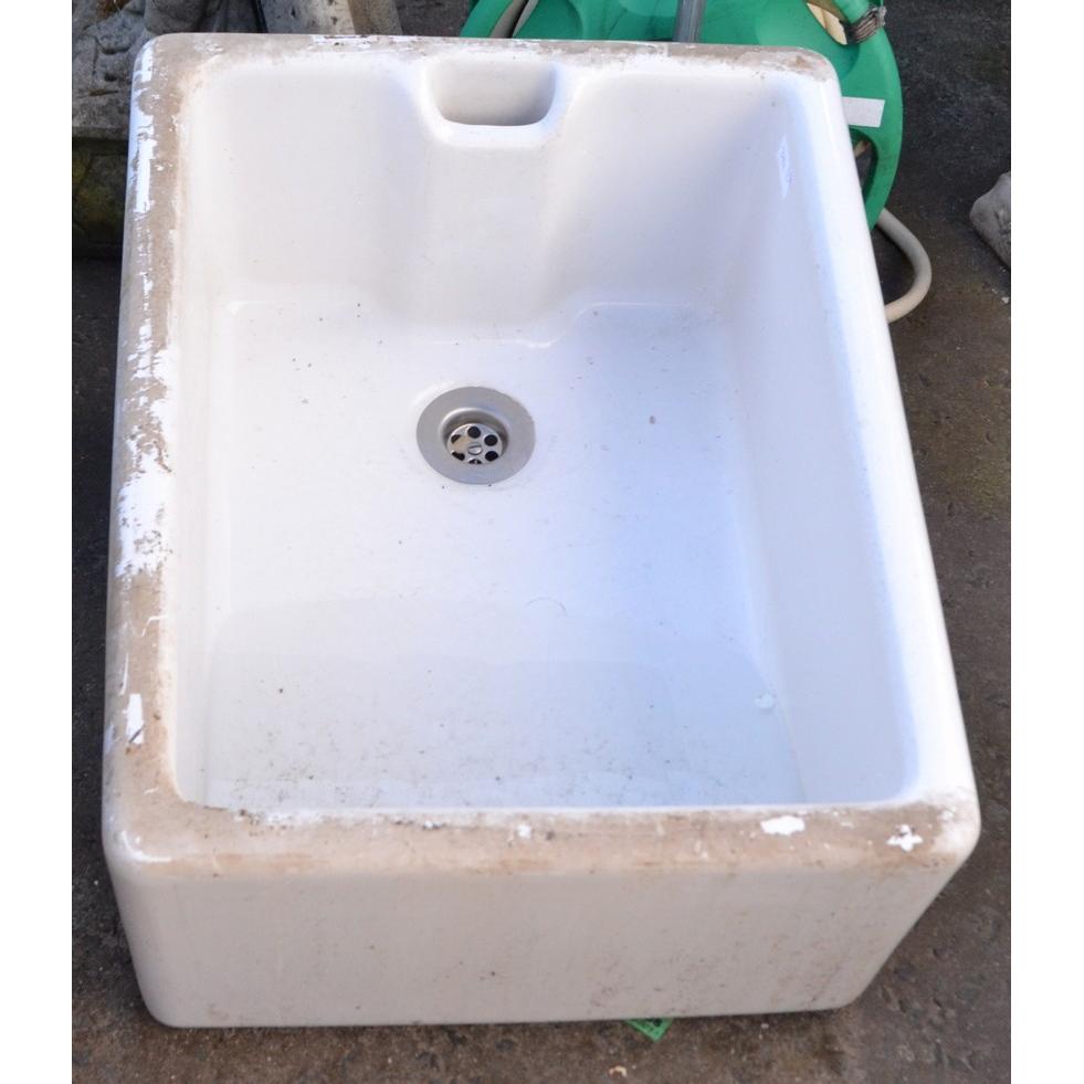 White ceramic sink suitable for planting in the garden or cleaned up for a kitchen etc, no cracks or chips visible