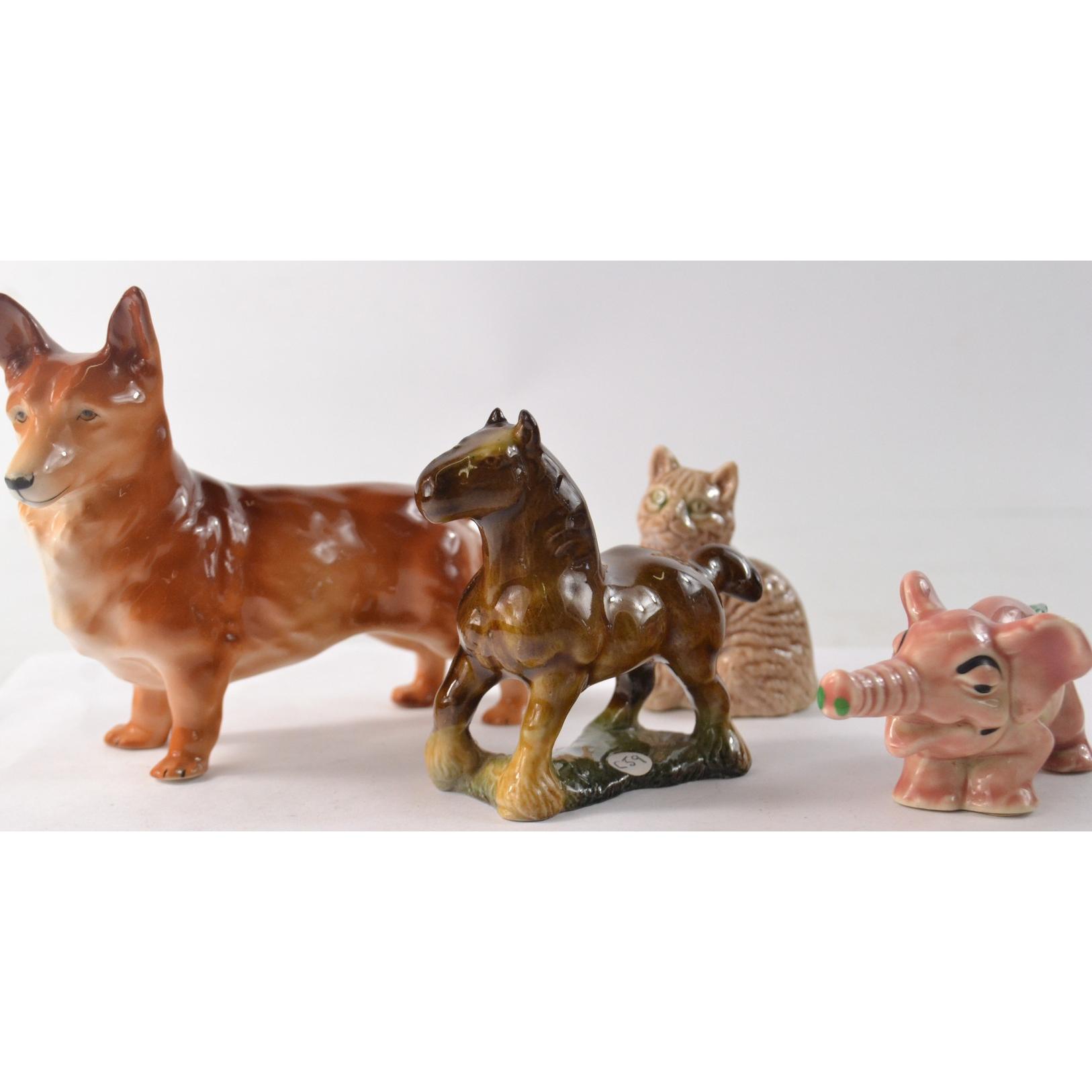 ADDERLEY CORGI, L 9cm approx SHAMROCK POTTERY pink pig, ceramic cat and cob Welsh style pony (4qty)