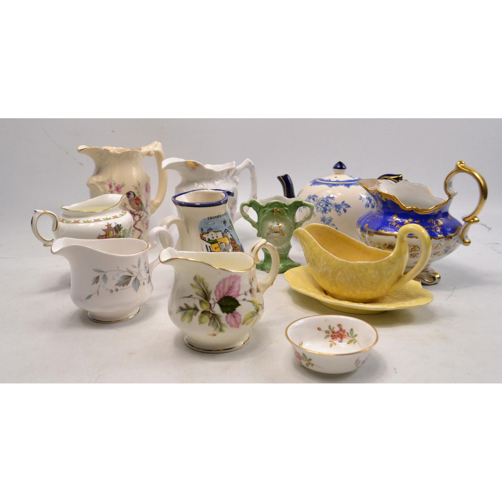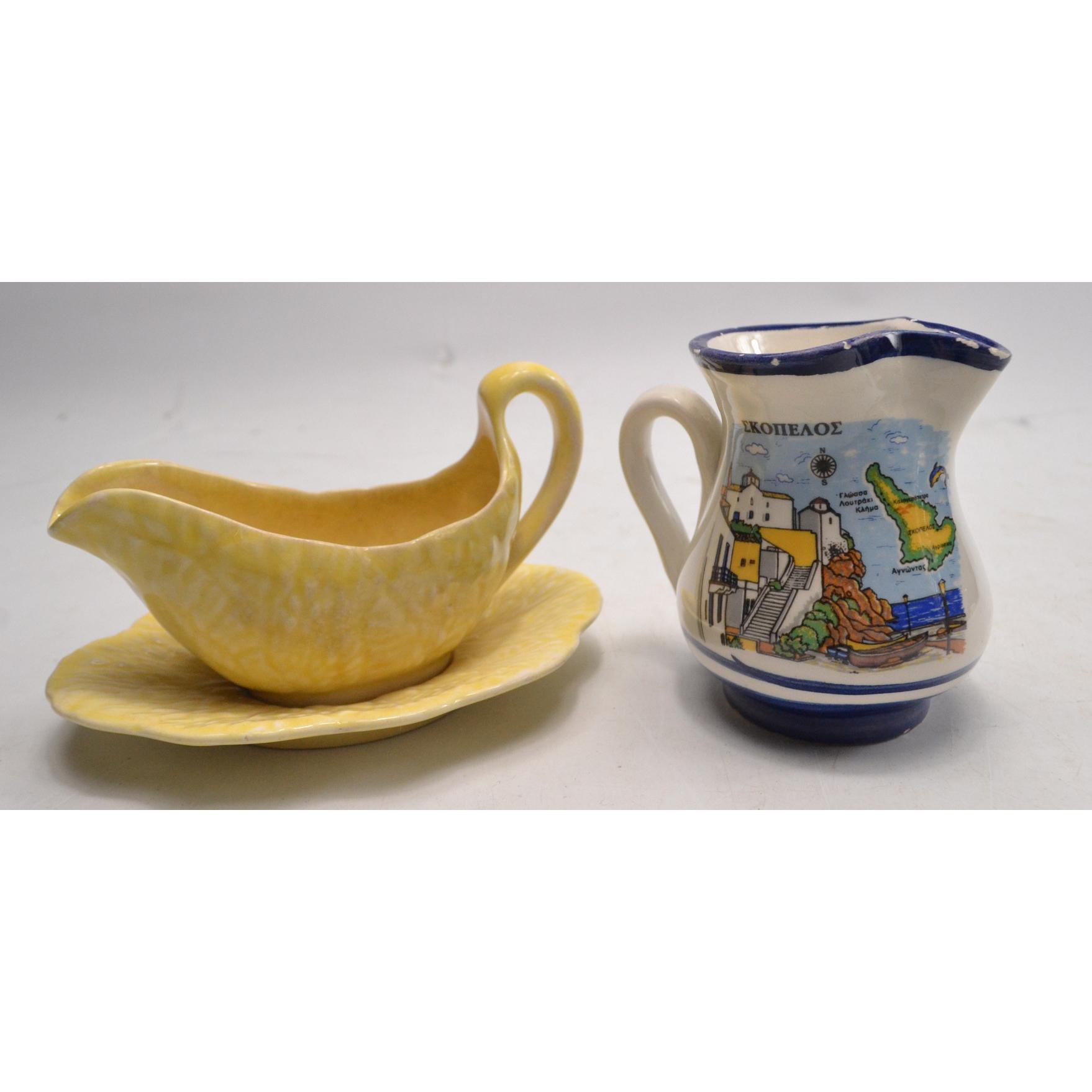 Selection of china. To include lemon coloured Devon ware cream and saucer, mixed tea cups etc