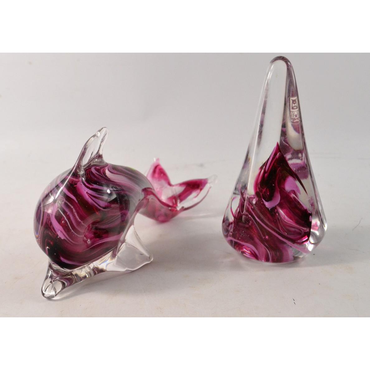 Two pieces of Mdina glassware. To include Dolphin (20cm by 10cm approx) and cranberry coloured paper weight (15cm tall approx)