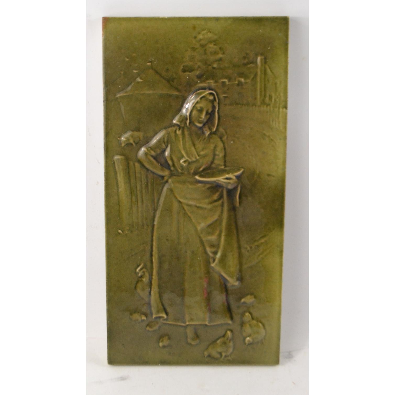Large green tile 'Woman with chicks' from IronbridgeL: 30cm approx W: 15cm approx