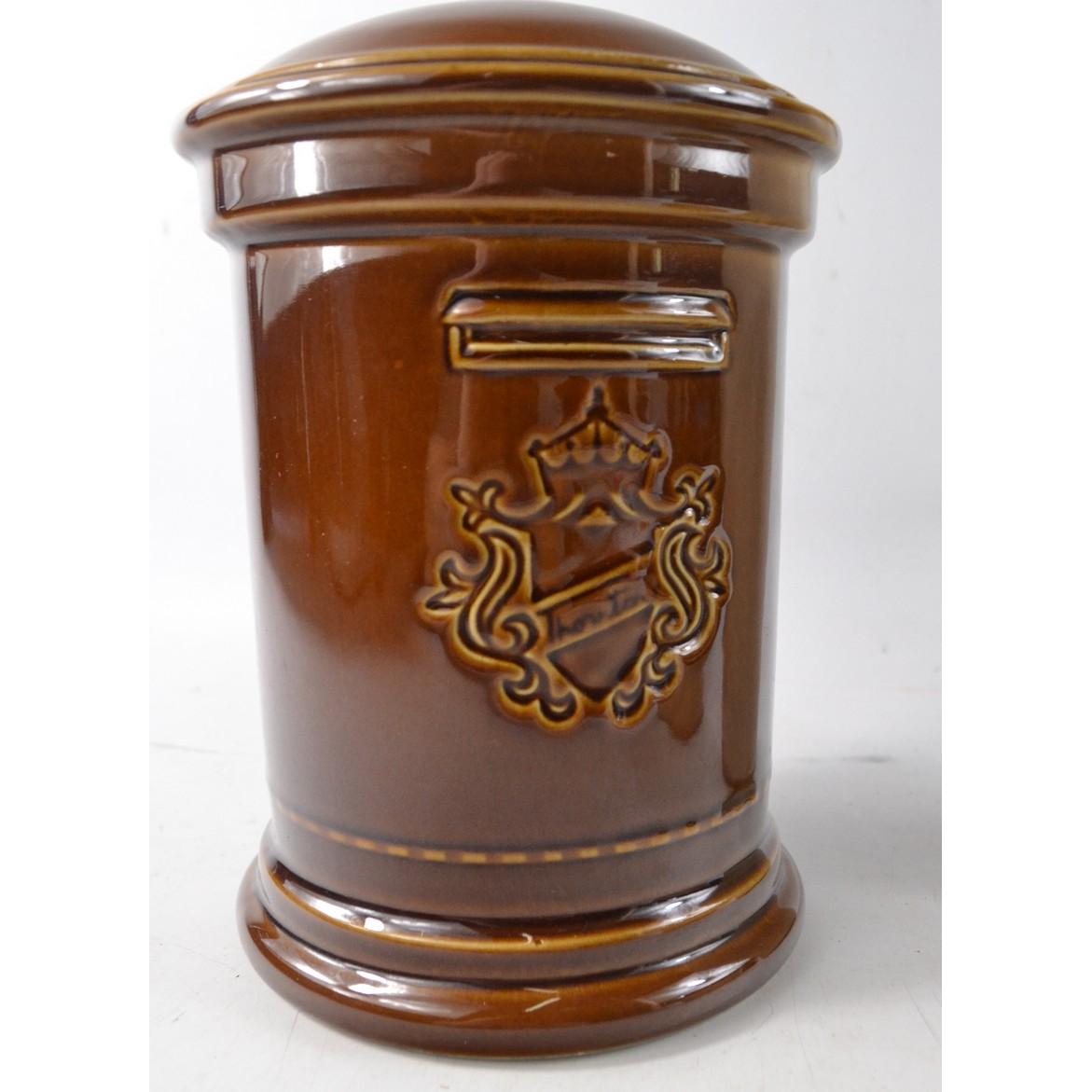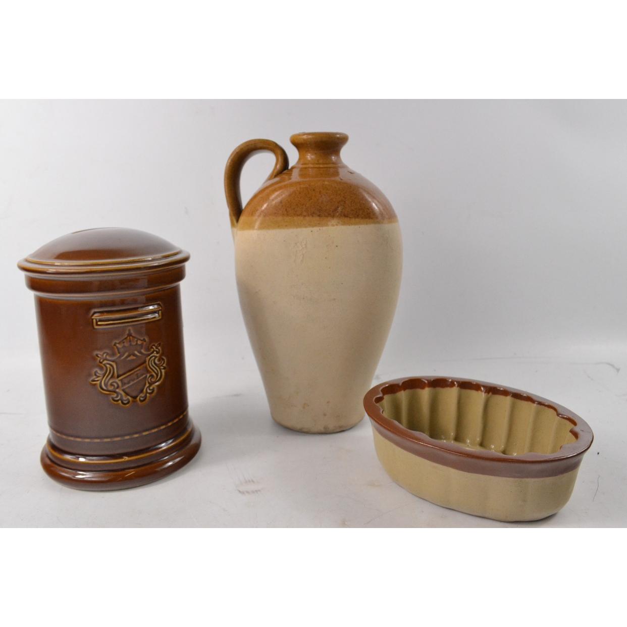 Stoneware flagon (approx 25cm tall), 'Bourne' ceramic jelly mould and two tone money box