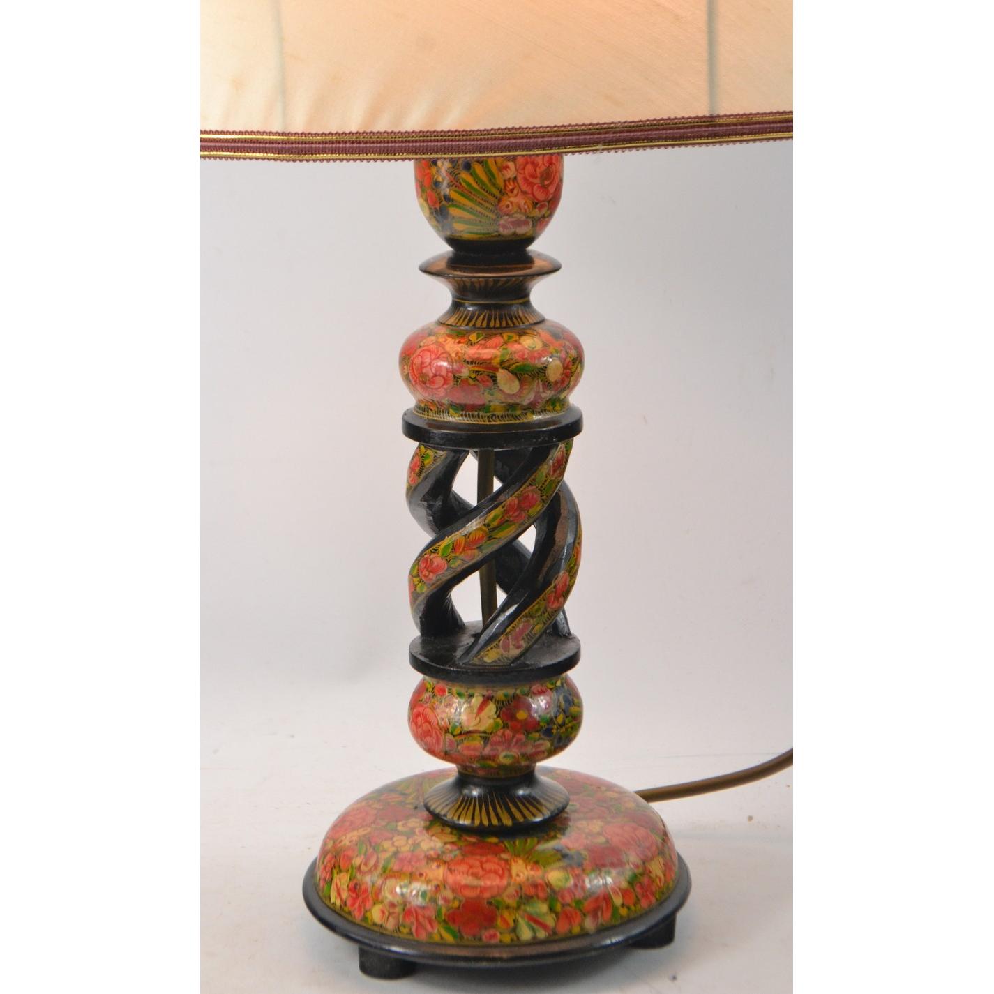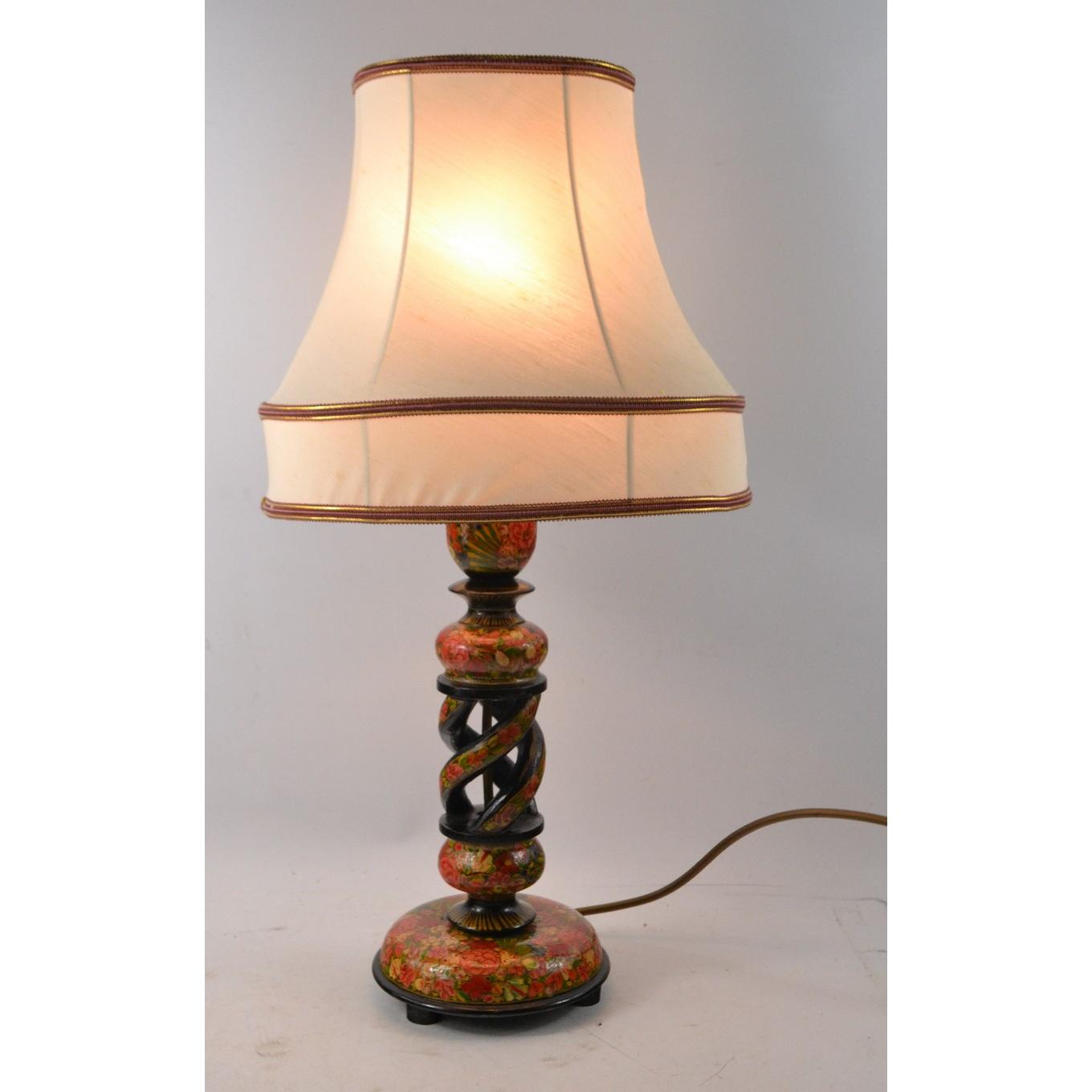 Papier mache table lamp with red floral and spiral design. With shadeH: 52cm approx