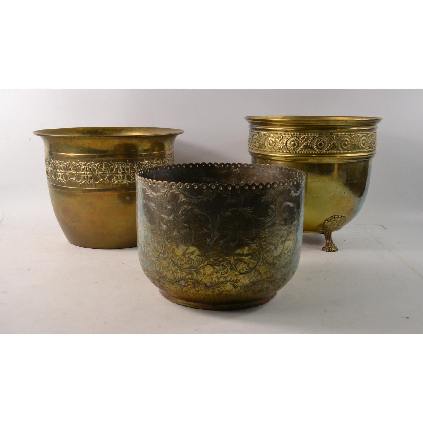 Three brass indoor plant holders. One in Indian design (W:21cm), one with floral band (W:24cm) and one with Glasgow style floral pattern (W: 26cm)