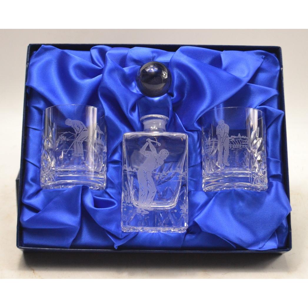ROYAL SCOT crystal golfing design mini-whisky glasses and decanter in presentation box
