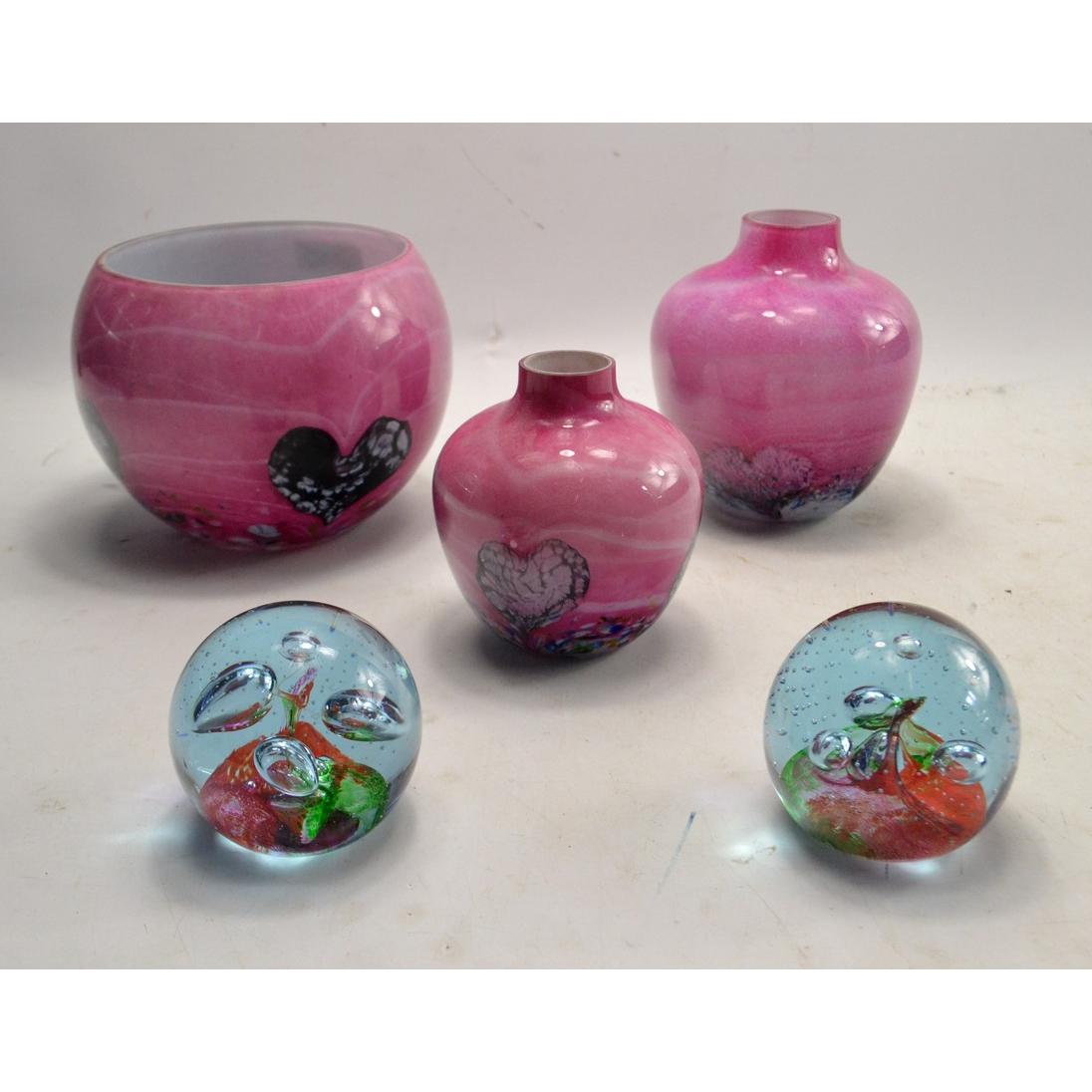 Three pieces of Caithness style posy vases and 2 Caithness paperweights