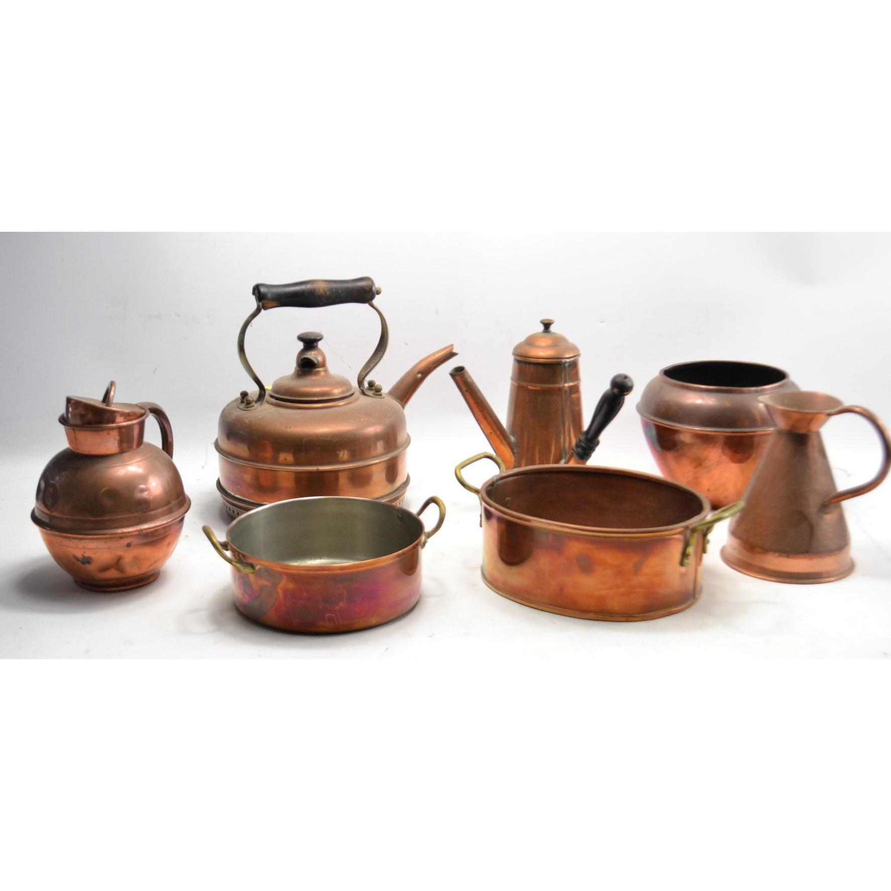 Mixed lot of copper items including kettle, chocolate pot etc