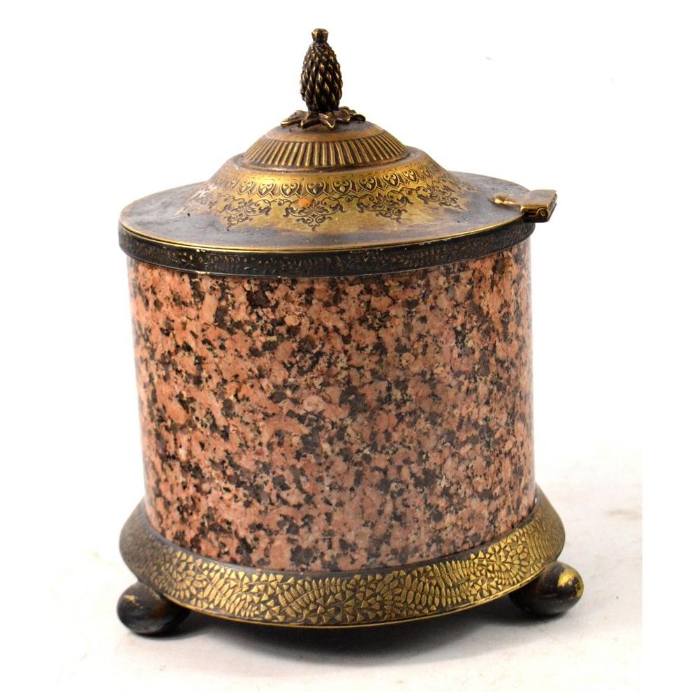 An old quality tobacco caddy with ornate lid, and silvered white metal interior with an outer marble style casingH: 15cm approx