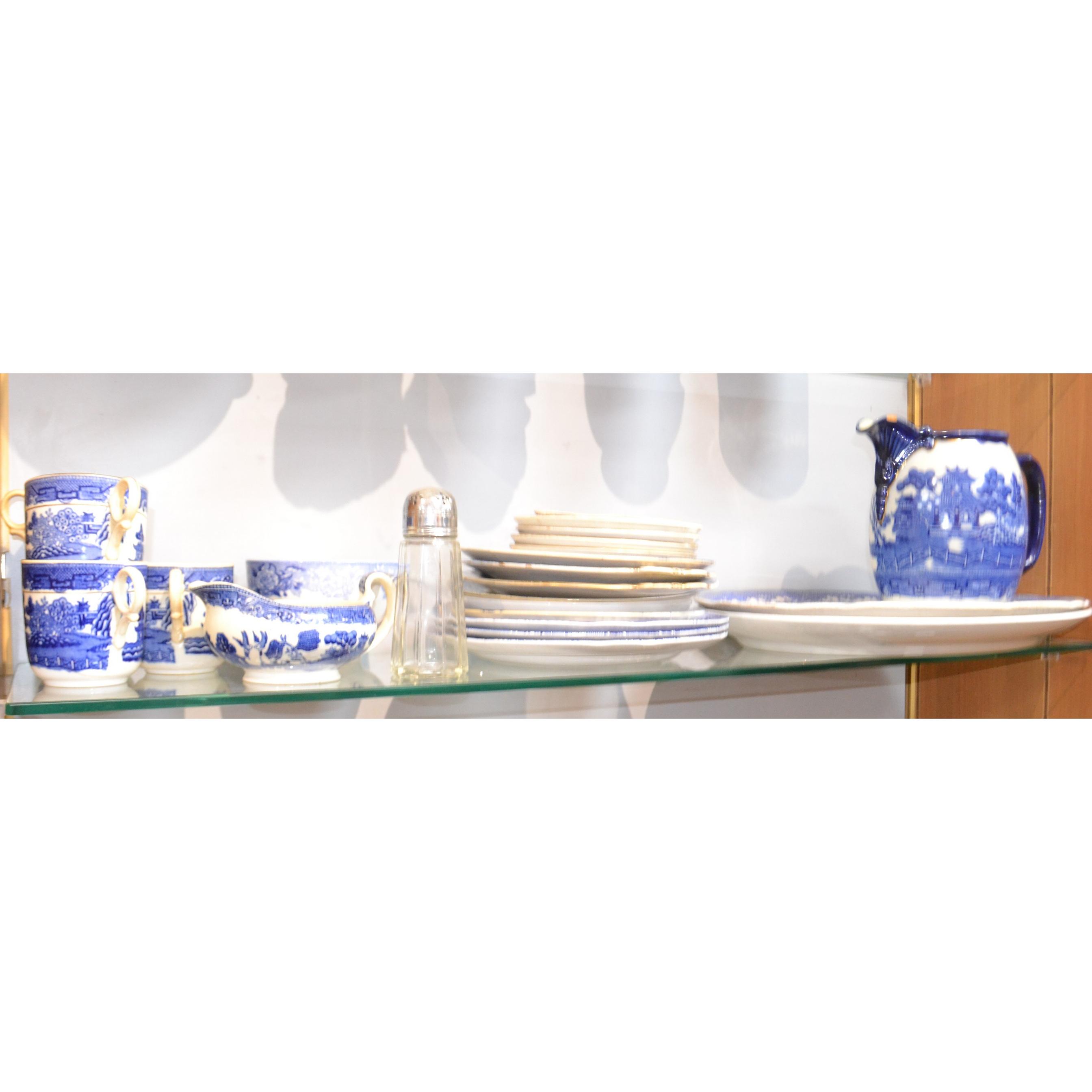 A large selection of blue and white ware to include large stoneware ashette's, jug, plates and cups etc