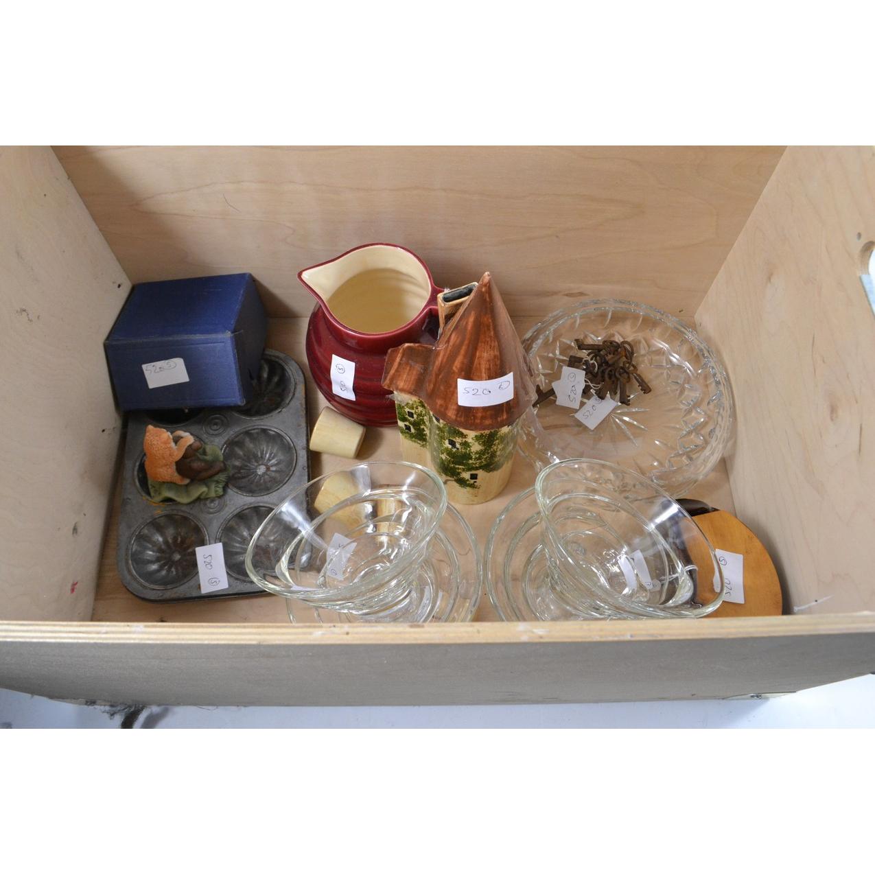 A collection from France in rather a nice wooden box to include an unusual vintage tin bun mould, ceramic ware, a nice jug, etc etc