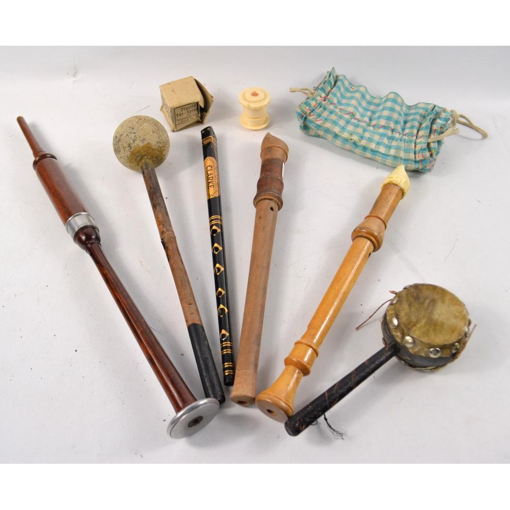 A collection of musical recorders, some really old! and an old chanter style instrument and a vintage cymbal stick?