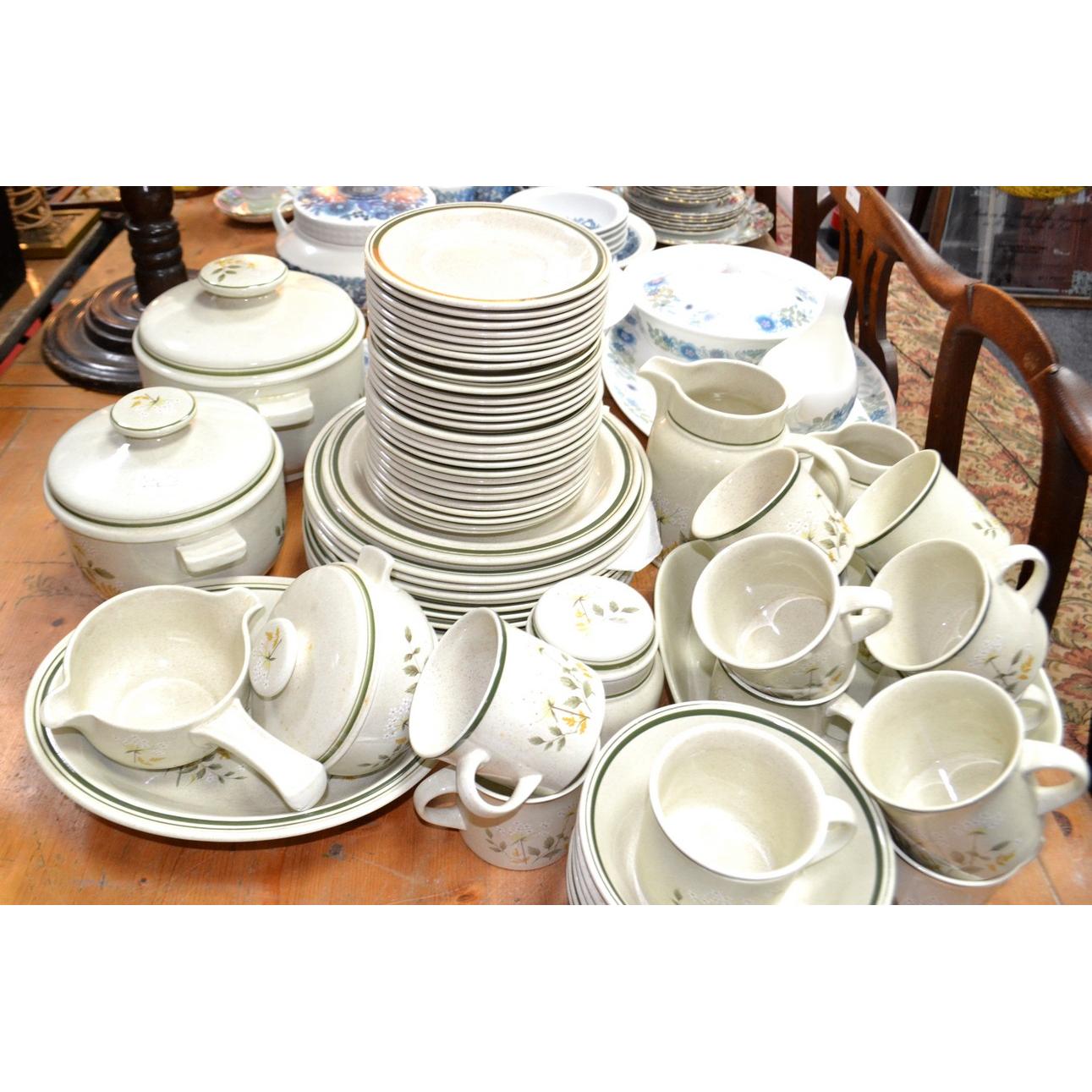 ROYAL DOULTON LAMBETHWARE 'Will O The Wisp' dinner service. To include 10 large dinner plates, 1 medium dinner plate, 3 casserole dishes, large med and smaller one, 2 serving dishes, one square and one oval, 13 side plates, 6 dessert plates, 14 saucers, 13 cups, 1 sugar dish with lid, 1 large jug, and 1 handled sauce server.