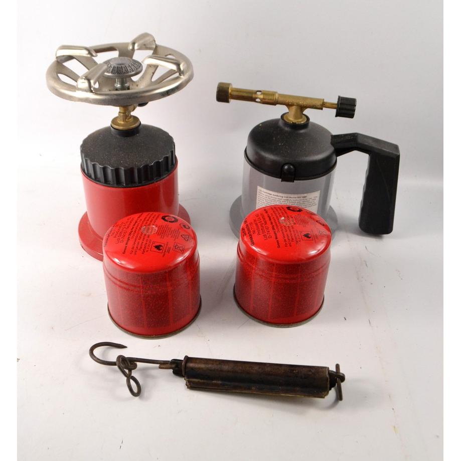 Box to include camping gas burner, camping gas canister blow torch, 2 spare canisters and brass scales