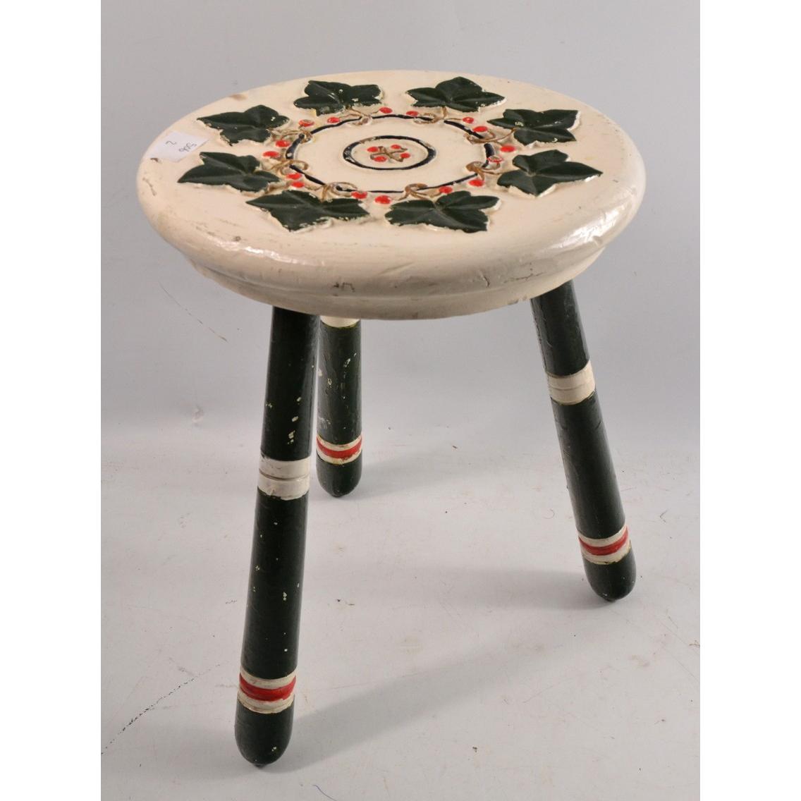 Tri-legged stool with green painted legs and holly leaf design topW: 28cm approx H: 35cm approx
