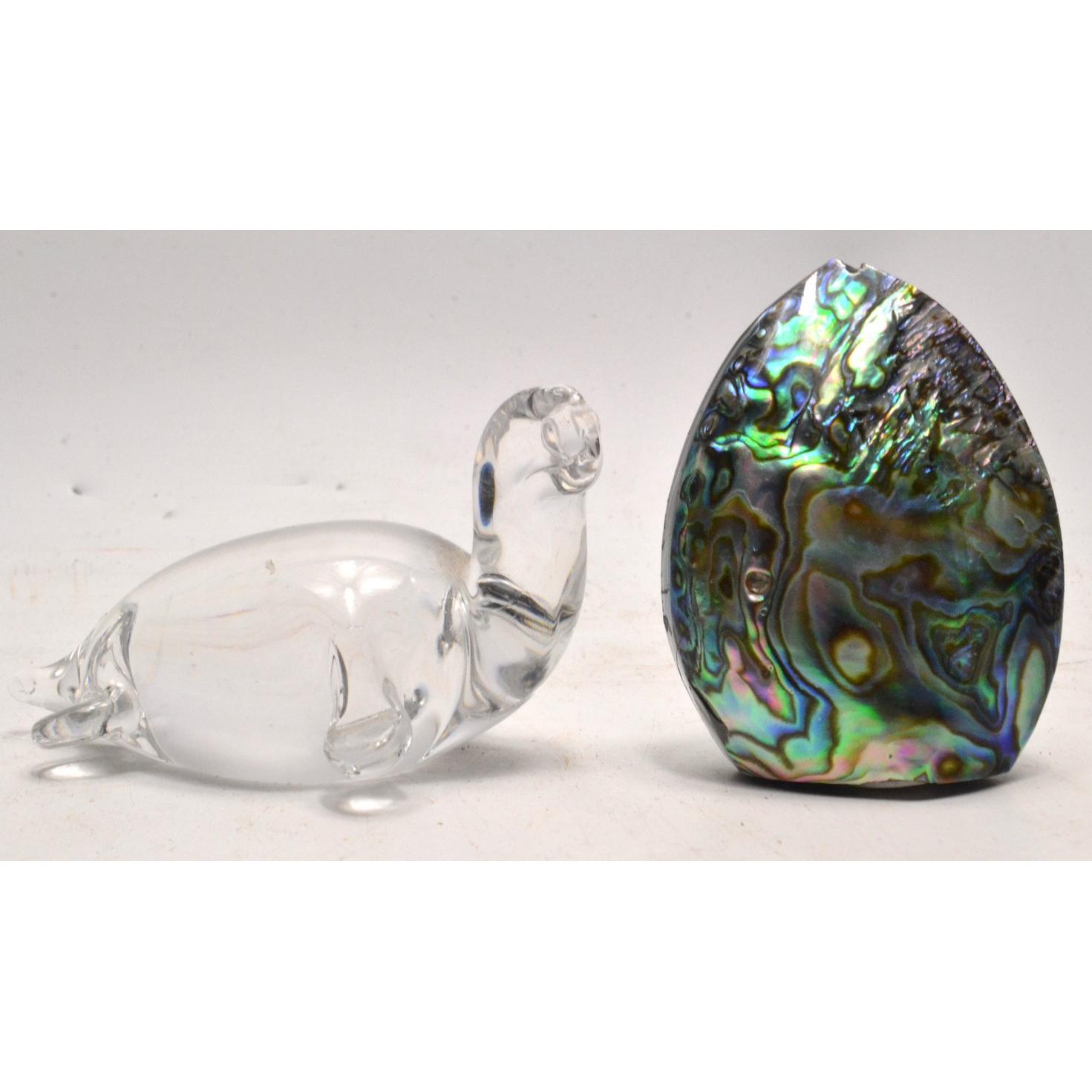 Exquisite and cute! small glass turtle ornament marked NV to base H 5cm x L 7cm approx and an abalone salt dispenser 6cm LApprox 2 pieces