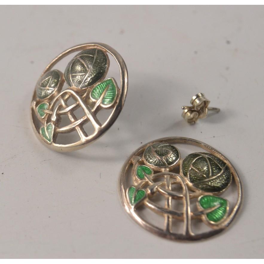 Boxed pair of 925 silver earrings with Glasgow rose enamel work