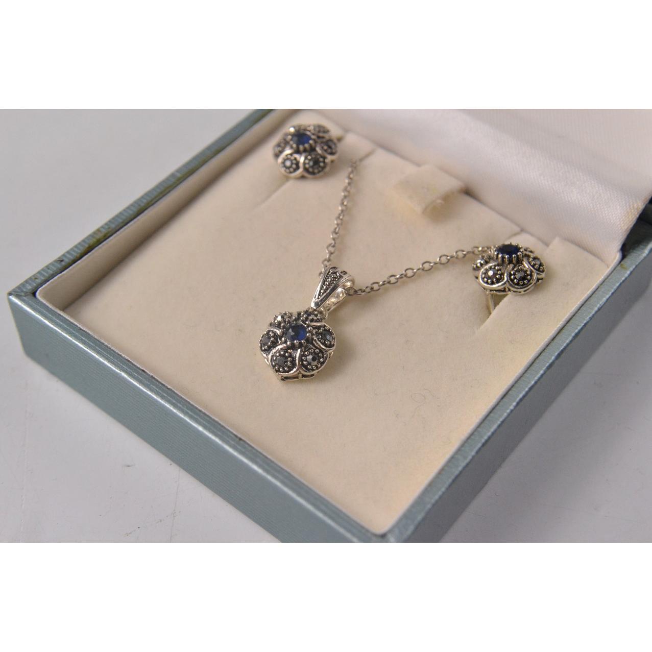 Matching set of 925 silver earrings and necklace in flower head design set with blue centre stone and marcasite petalsW: 1cm approx