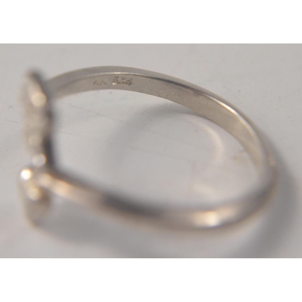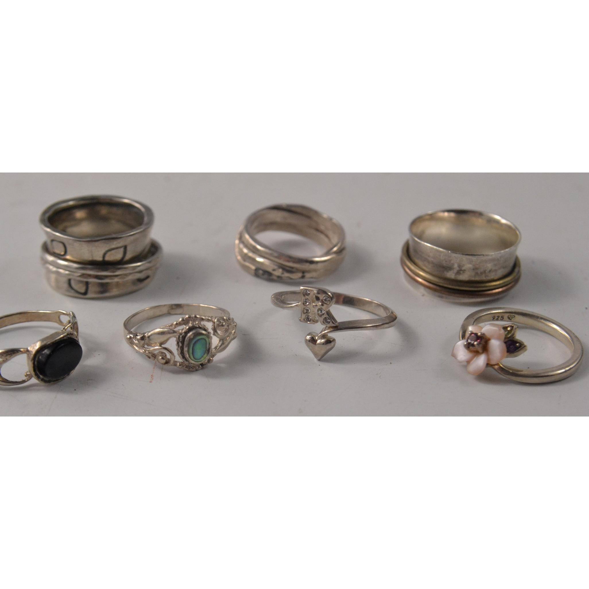 Selection of 4 925 silver and 3 white metal rings. (2 with unreadable markings) to include mother of pearl set ring (size M), R with love heat (size Q/R), triple band ring (size O), 925 floral design ring set with 3 coloured stones (size H), black stone set ring (size M/N), 925 band ring with brass rings (size R), 925 band ring with leaf design (size M)