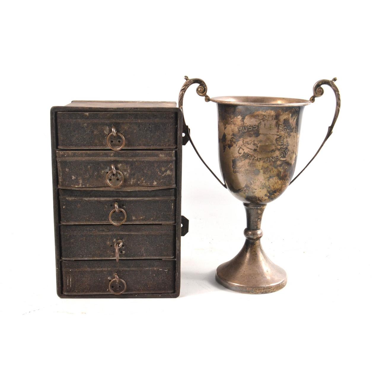 Small multi-drawer chest and a Musselburgh Golf Club Championship trophy.