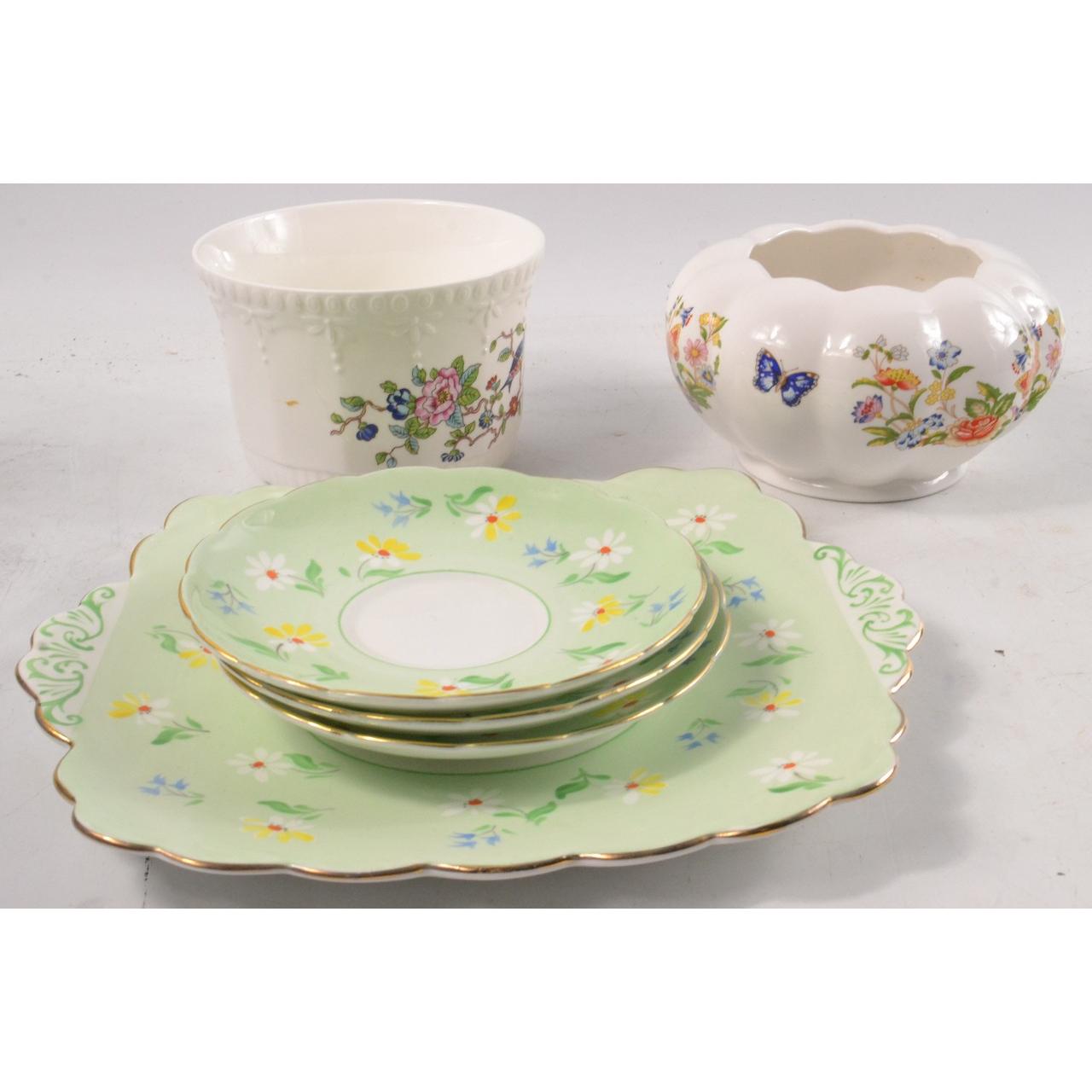AYNSLEY fine bone china cottage garden pot (D:14cm approx), AYNSLEY Fine bone china Pembroke small plant holder (D:12.5cmapprox) and a FOLEY vintage sandwich plate and three saucers