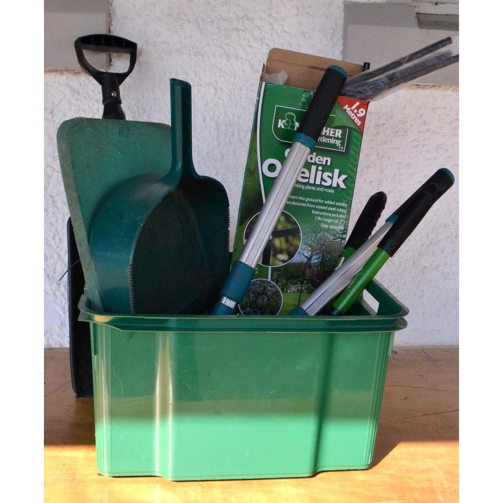Box of garden tools to include retractable snow shovel, large dust/leaf pan, garden obelisk, pruners etc