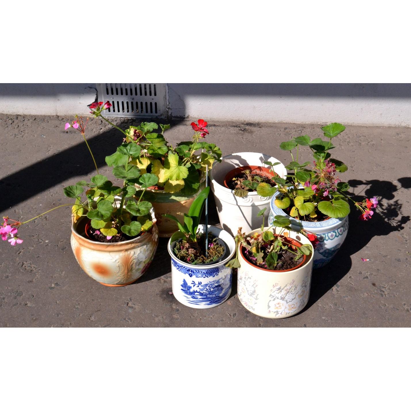 Six ceramic and terracotta planters including plants. 1 oriental design, 1 blue and white willow pattern etc
