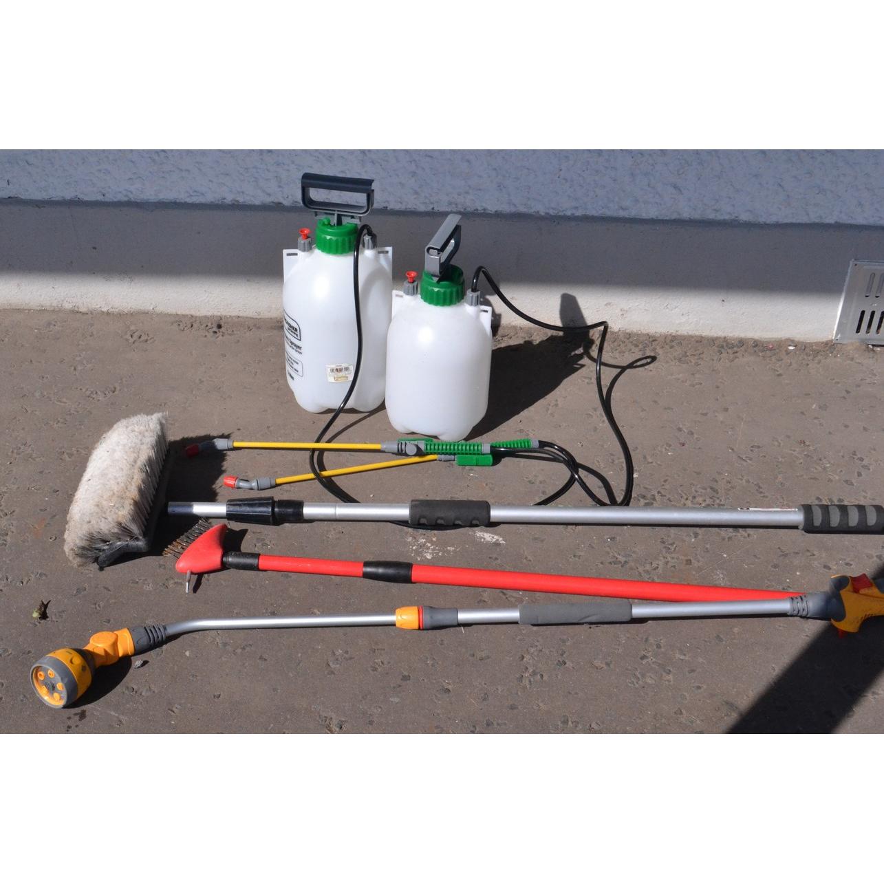 Selection of outdoor tools to include extendable brush, 2 weed killer sprays etc