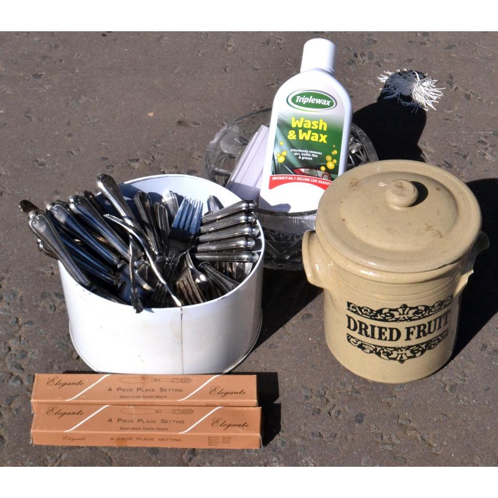 Mixed box to include cutlery, glass bowl, stoneware jar etc