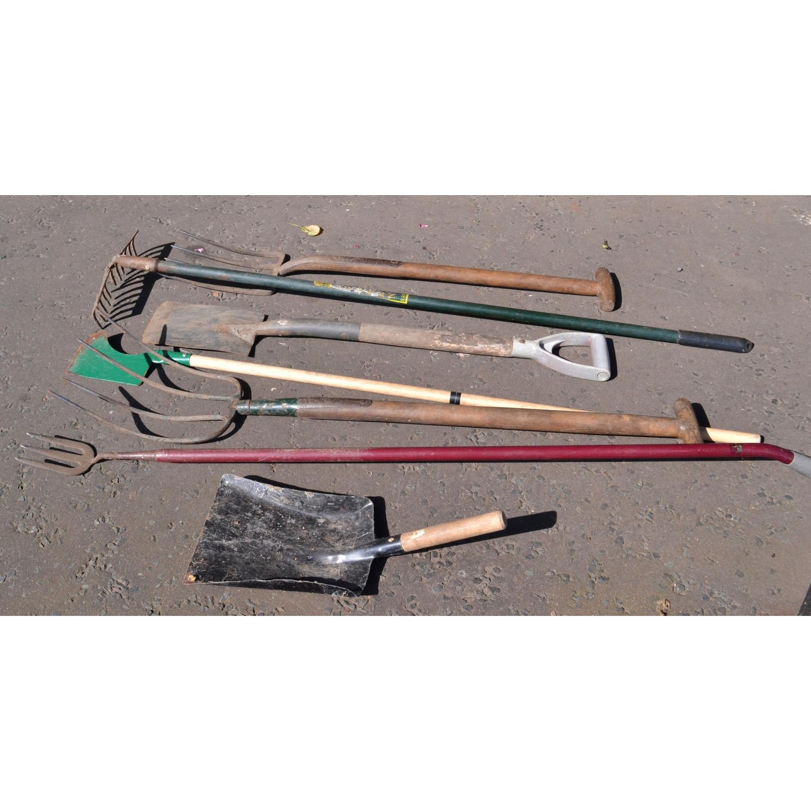 Selection of garden tools to include 2 forks, 2 edgers etc