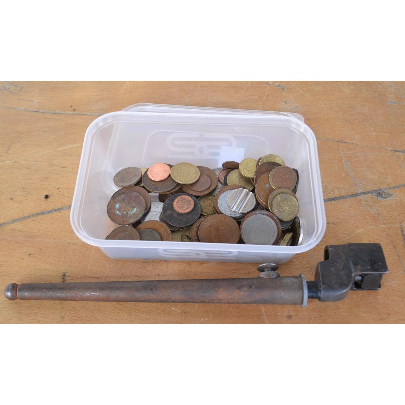Selection of vintage British coins plus a rifle bayonet and cover