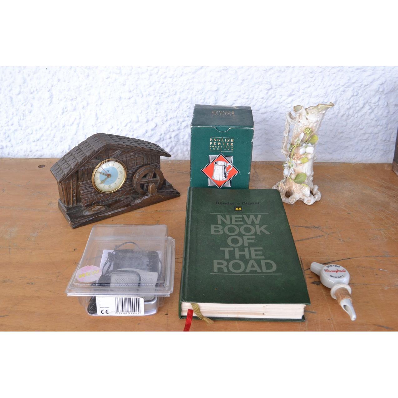 Mixed box containing portable Roberts radio, clock, china, road volume, tankard