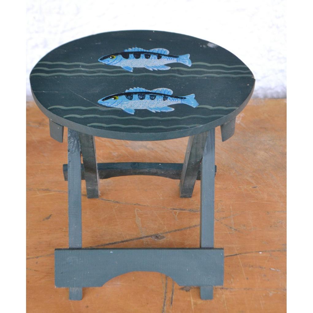 A small folding fisherman's seat, hand painted showing fish 30cm square seat, 1 ft height approx