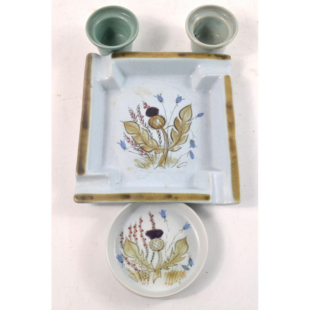 Buchan pottery ash tray (W: 19cm approx), thistle design pin dish (W: 10cm approx), 2 small pots