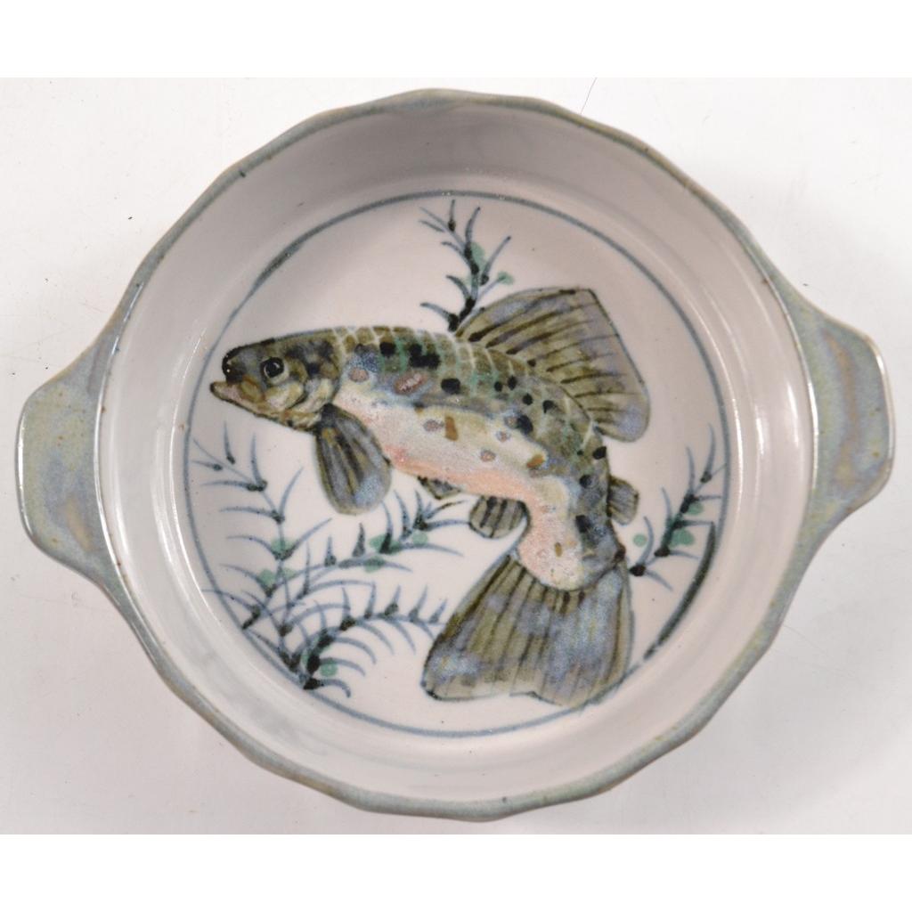 Buchan pottery twin handled dish with trout hand painted design (Dia: 19cm approx)
