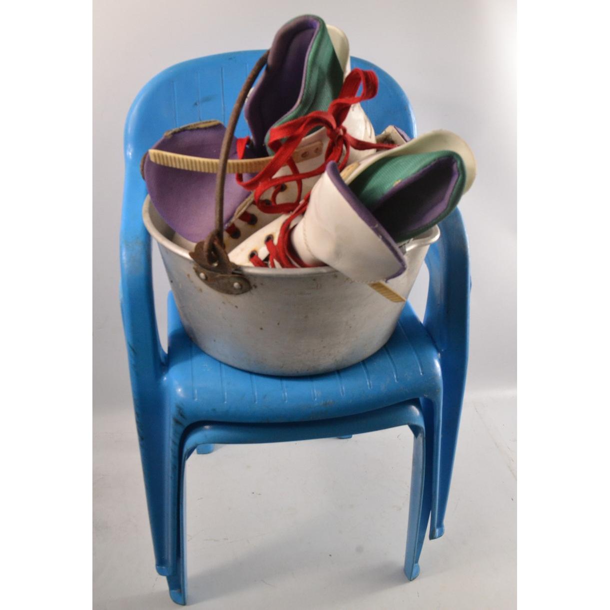 Two children outdoor chairs, pair of roller blades and jelly pans