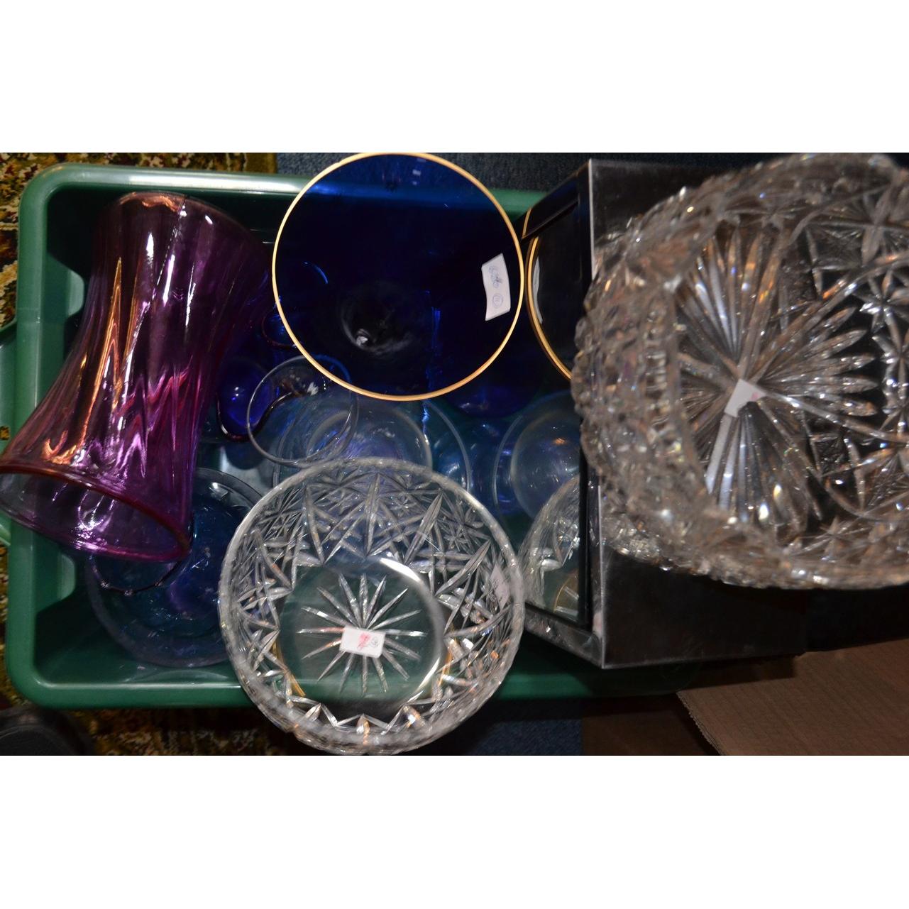 Selection of coloured glass vases, crystal vases, bowls and cabinet etc