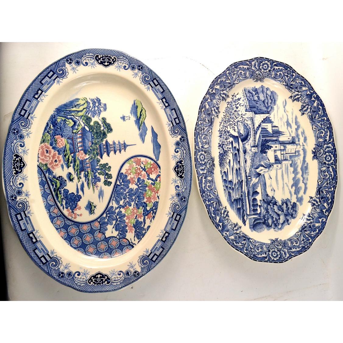 2 large ceramic salvers blue and white, one with a nice oriental scapeApprox 2 pieces
