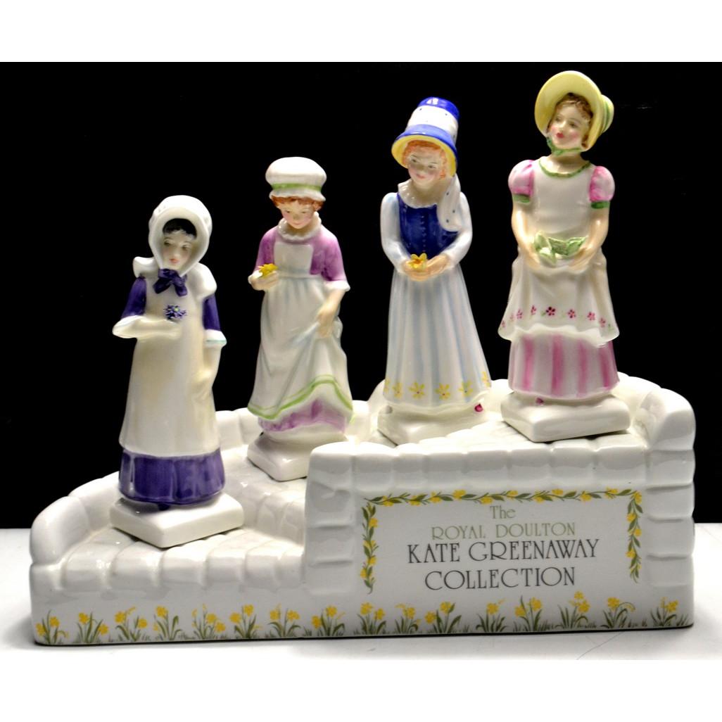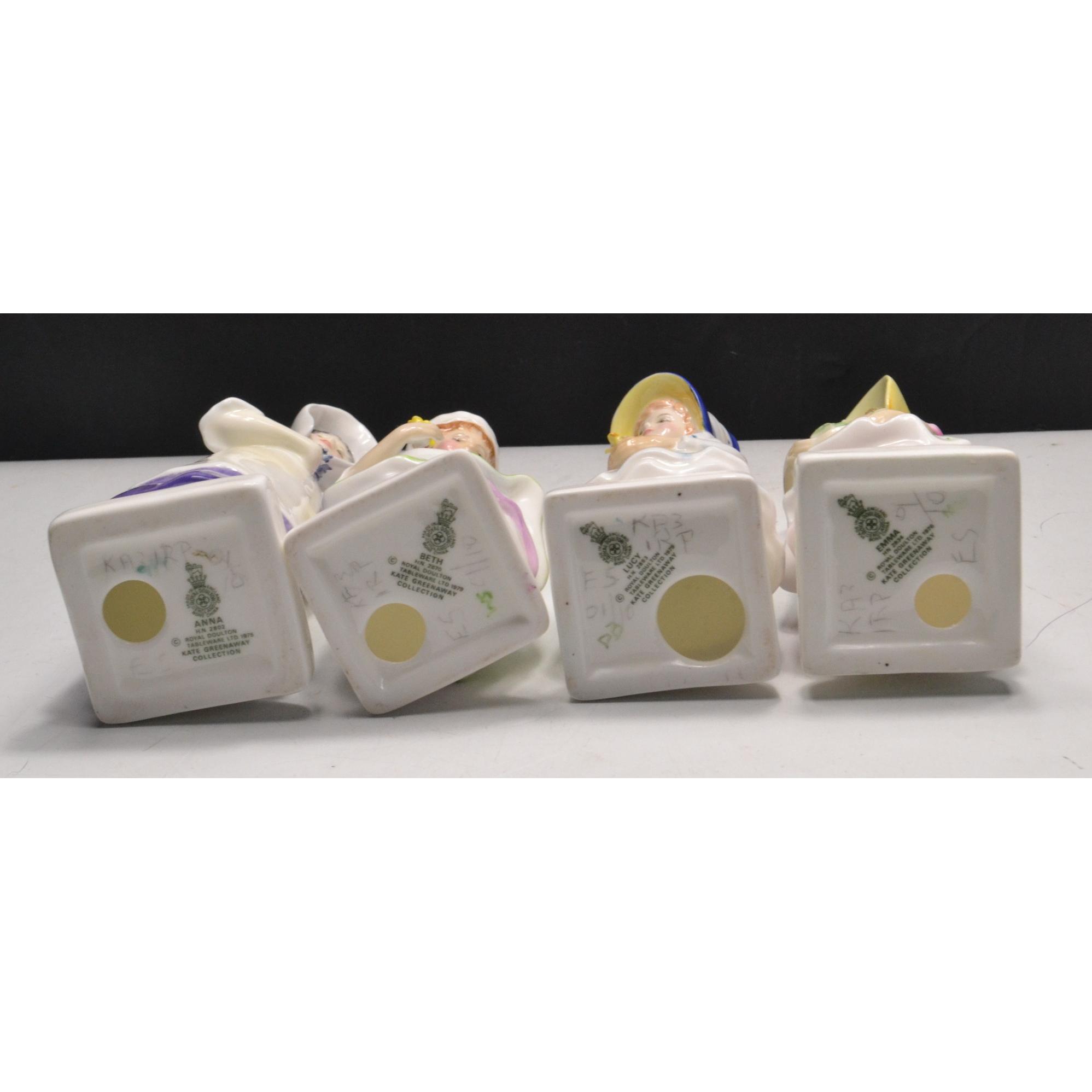 Selection of 4 Royal Doulton Kate Greenway designed figures with stand. HN 2834 'Emma', HN 2863 'Lucy', HN 2802 'Anna', HN 2870 'Beth'