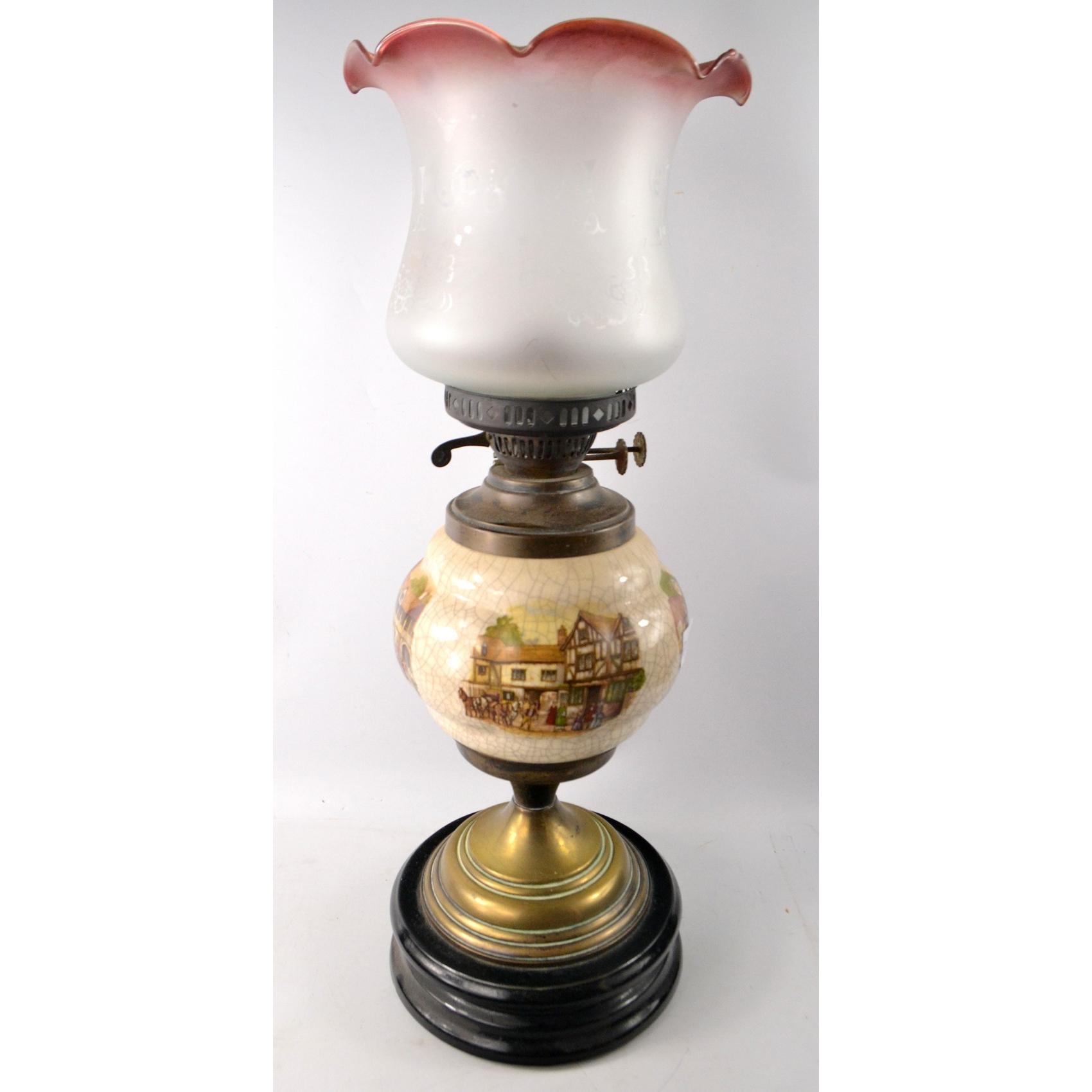 A Victorian Bavarian style ceramic and brass lamp with beautiful glass font shade sits around 2ft tall.