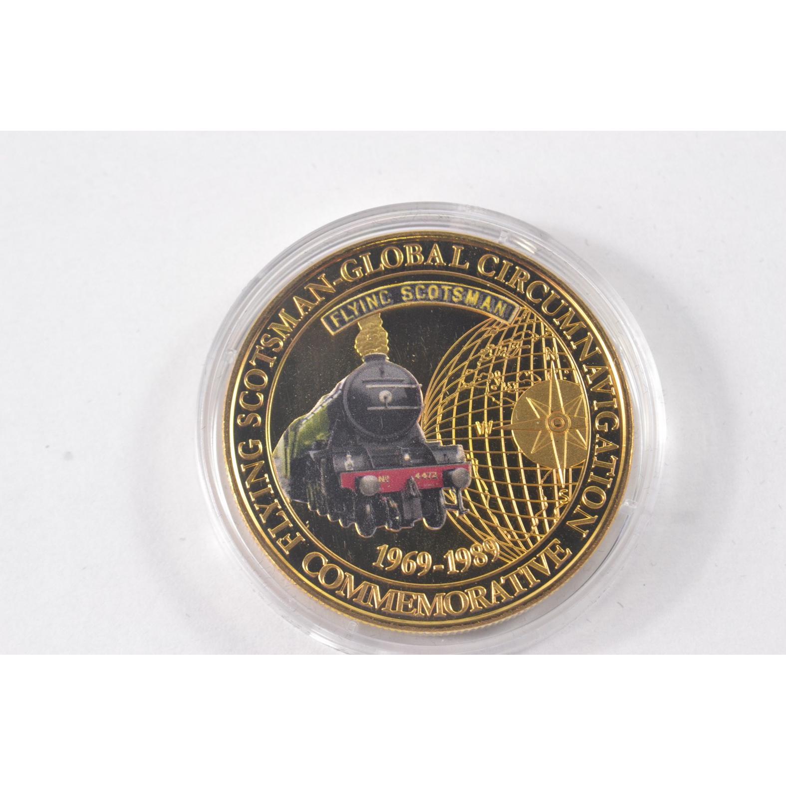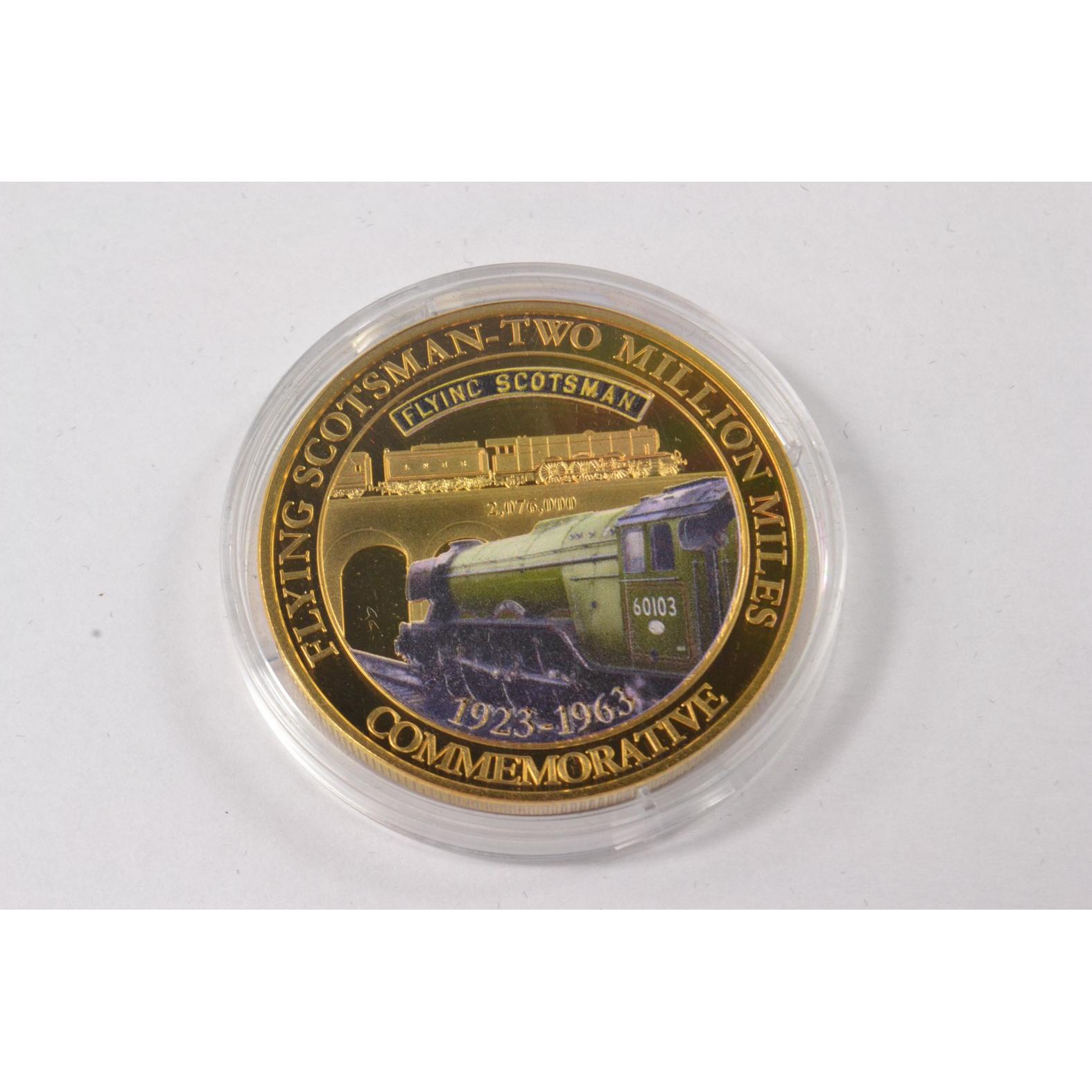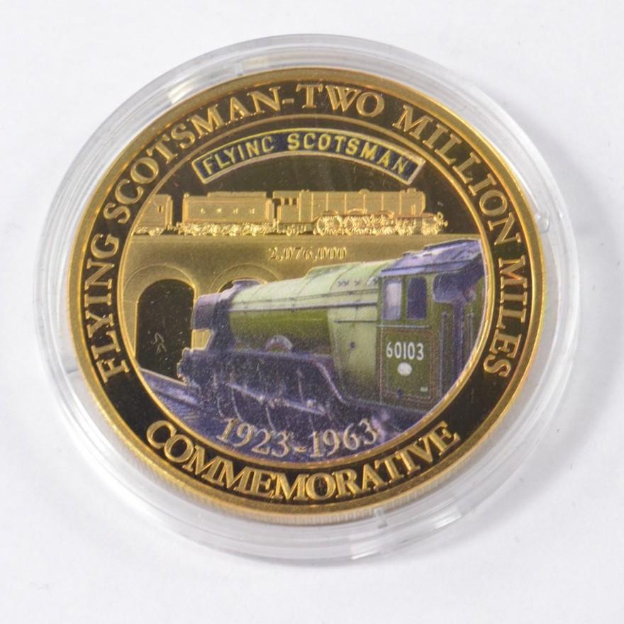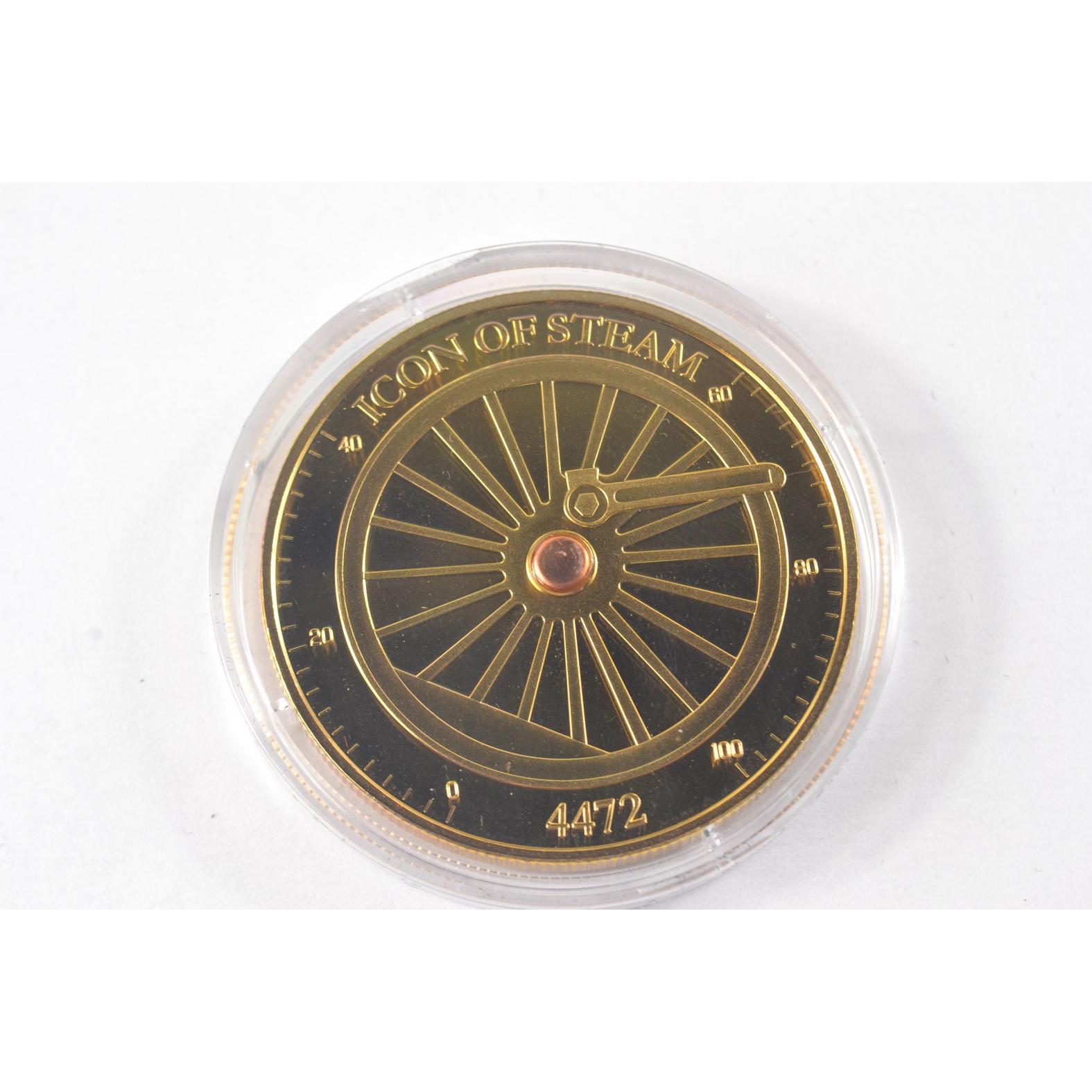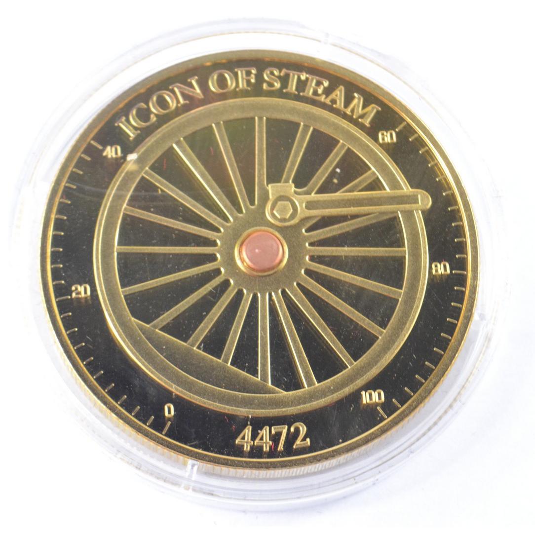 Full set of 8 gold plated collectors coins displaying vintage steam trains to include The Flying Scotsman