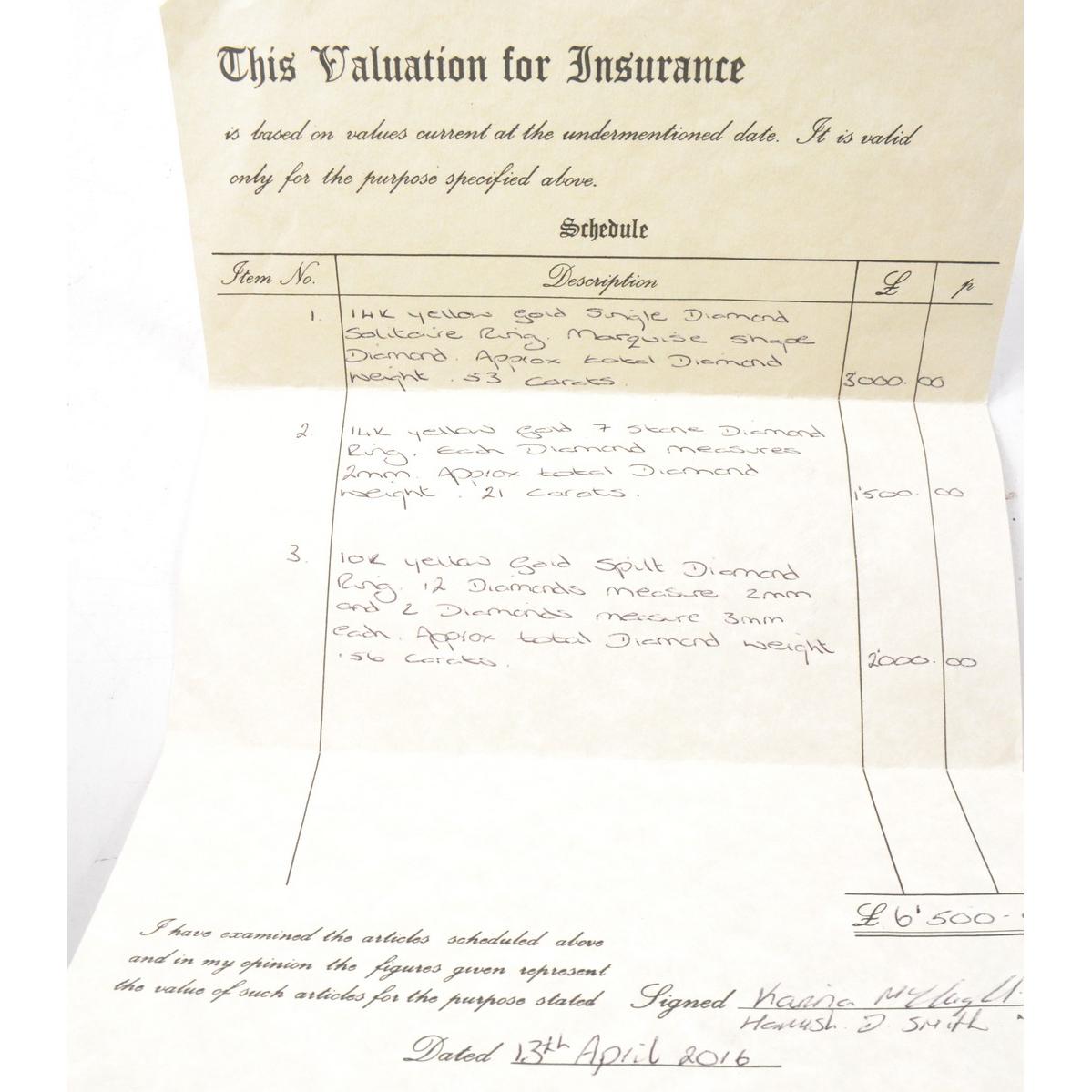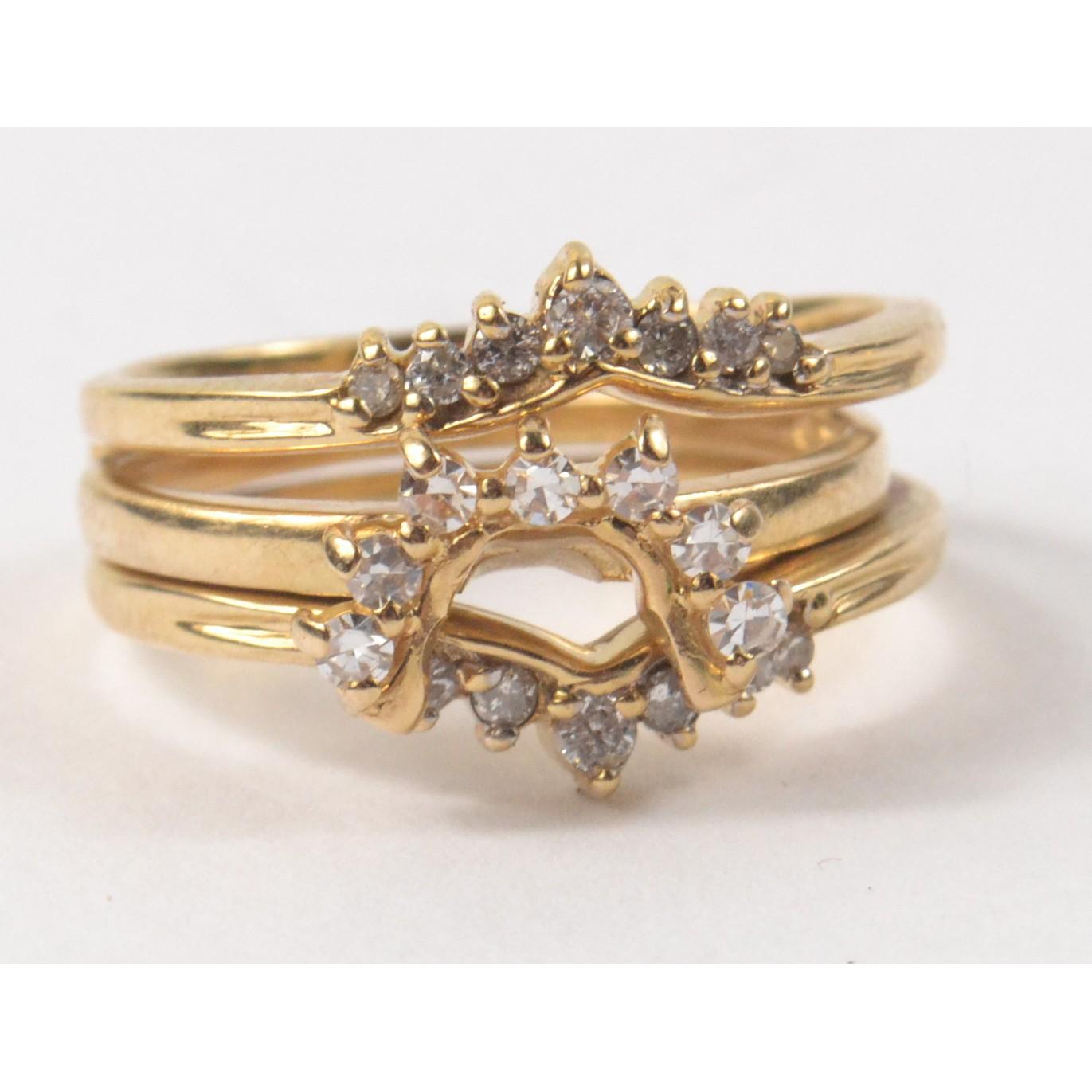 UNUSUAL Set of 3 14k yellow gold rings set with diamonds. Main ring split design with 2 interchangeable inserts. One insert set with marquise cut diamond, other horseshoe shape. With insurance valuation and certificate of ownership. Size N